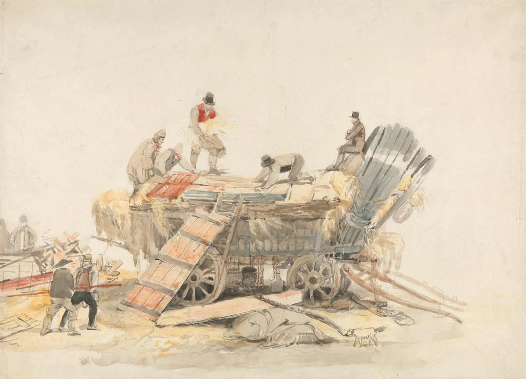 W dziele "Ładowanie wozu" Luke Clennell uchwycił żywy i dynamiczny moment życia wiejskiego. Postacie, zaangażowane w wspólne zadanie, są przedstawione z dużą dbałością o szczegóły, ich wyrazy i postawy przekazują wysiłek i determinację. Dominują kolory ziemiste, przywołując ciepło i prostotę codziennej pracy. Technika Clennella, łącząca akwarelę i rycinę, tworzy atmosferę zarówno realistyczną, jak i poetycką, zachęcając widza do odczuwania braterstwa i zapału pracujących.