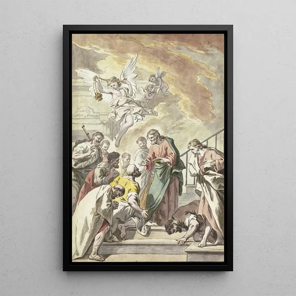 Dans "Le Christ donne la Cène", Jean Jouvenet nous offre une représentation poignante de l'un des moments les plus significatifs de la tradition chrétienne. La composition, centrée sur le Christ entouré de ses apôtres, dégage une atmosphère de recueillement et de solennité. Les couleurs chaudes et les jeux de lumière accentuent la profondeur des émotions, tandis que les expressions des personnages témoignent de l'intensité du moment. Jouvenet, avec sa maîtrise technique, parvient à capturer la gravité de la scène tout en conservant une certaine douceur, rendant cette œuvre à la fois accessible et profondément spirituelle.