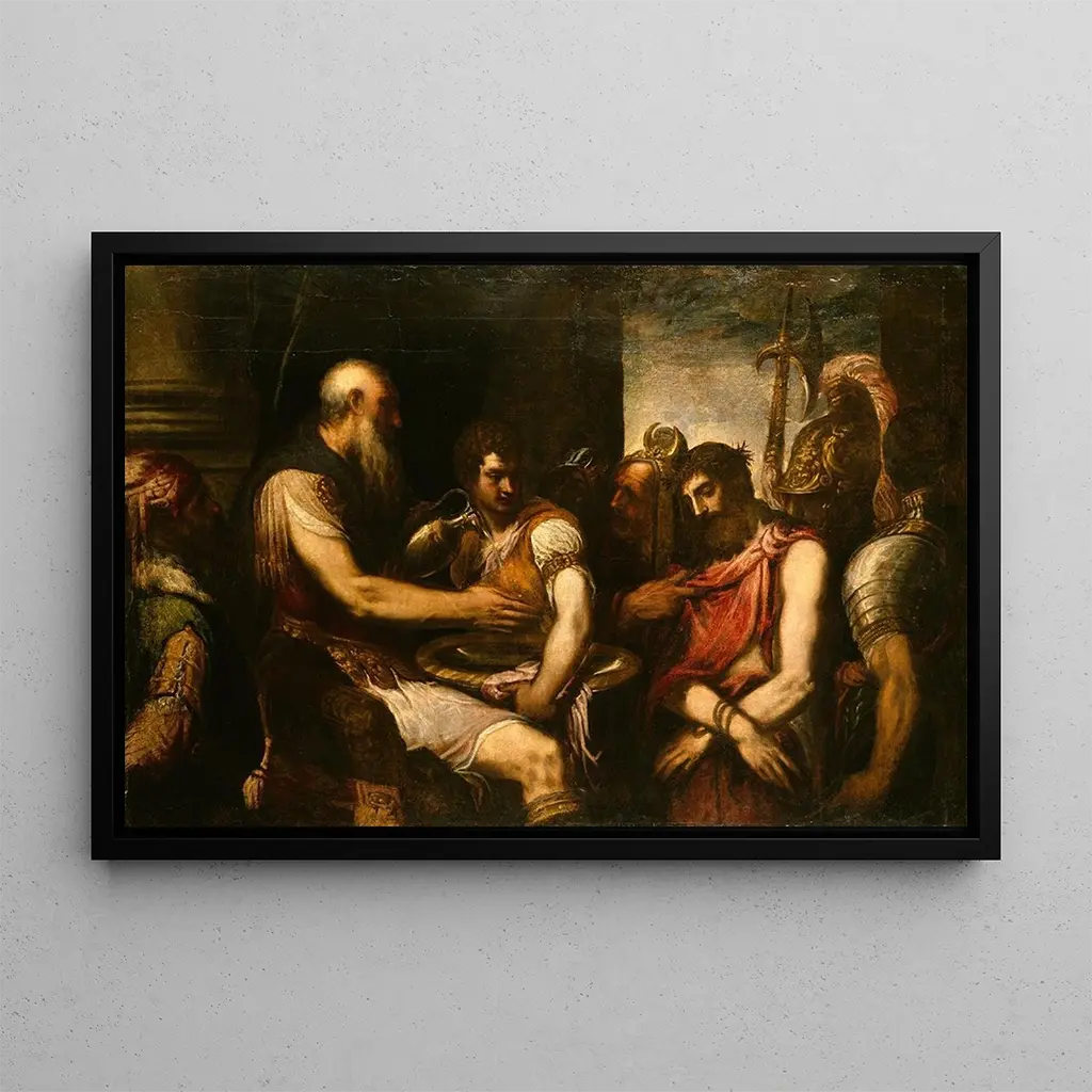 Obraz "Chrystus przed Piłatem" autorstwa Andreę Schiavone to uderzające dzieło, które oddaje intensywność chwili, gdy Jezus stoi przed rzymskim gubernatorem. Bogate kolory i uderzające kontrasty tworzą atmosferę namacalnego napięcia. Dynamiczna kompozycja, z wyrazistymi postaciami i wymownymi gestami, zachęca widza do odczuwania niepokoju i determinacji emanujących z tej sceny biblijnej. Drobne szczegóły ubrań i twarzy świadczą o mistrzostwie technicznym Schiavone, podczas gdy użycie światła podkreśla dramatyzm i emocjonalną głębię dzieła.