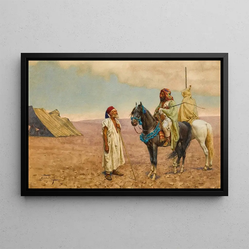 Le Messager : oda do piękna codzienności W "Le Messager" Giulio Rosati przenosi nas w intymną scenę, gdzie światło bawi się z cieniami, ukazując delikatność detali. Kompozycja skupia się na młodym mężczyźnie, ubranego w tradycyjną tunikę, który wydaje się przekazywać ważną wiadomość. Ciepłe kolory, zdominowane przez odcienie ziemi i akcenty niebieskiego, tworzą atmosferę zarówno spokojną, jak i pełną emocji. Technika Rosatiego, łącząca realizm z romantyzmem, zachęca widza do odczuwania intensywności chwili, jakby można było usłyszeć szept posłańca. Giulio Rosati : mistrz orientalizmu realistycznego Giulio Rosati, włoski malarz XIX wieku, jest znany z dzieł, które uchwyciły esencję kultur orientalnych. Pod wpływem podróży do Afryki Północnej i Bliskiego Wschodu, potrafił oddać piękno i złożoność tych regionów poprzez swoje dzieło. Działał głównie między 1870 a 1900 rokiem, będąc częścią ruchu orientalizmu, który fascynował wielu artystów jego epoki. Jego styl, charakteryzujący się dbałością o szczegóły i bogatą paletą barw, świadczy o czasach, gdy Orient był postrzegany jako miejsce tajemnicy i egzotyki, oferując okno na odległe światy. Dekoracyjny nabytek z wieloma atutami Druk artystyczny "Le Messager" to element dekoracyjny, który wzbogaci Twoje wnętrze, niezależnie od tego, czy jest to salon, biuro czy sypialnia. Jakość druku i wierne oddanie oryginalnych kolorów sprawiają, że ta płótno jest idealnym wyborem dla miłośników sztuki. Estetyczna atrakcyjność tego dzieła tkwi w jego zdolności do wzbudzania ciekawości i inicjowania rozmowy. Włączając ten obraz do swojej dekoracji, wprowadzasz odrobinę elegancji i kultury, jednocześnie celebrując talent artysty, którego dzieło nadal rezonuje przez czas.