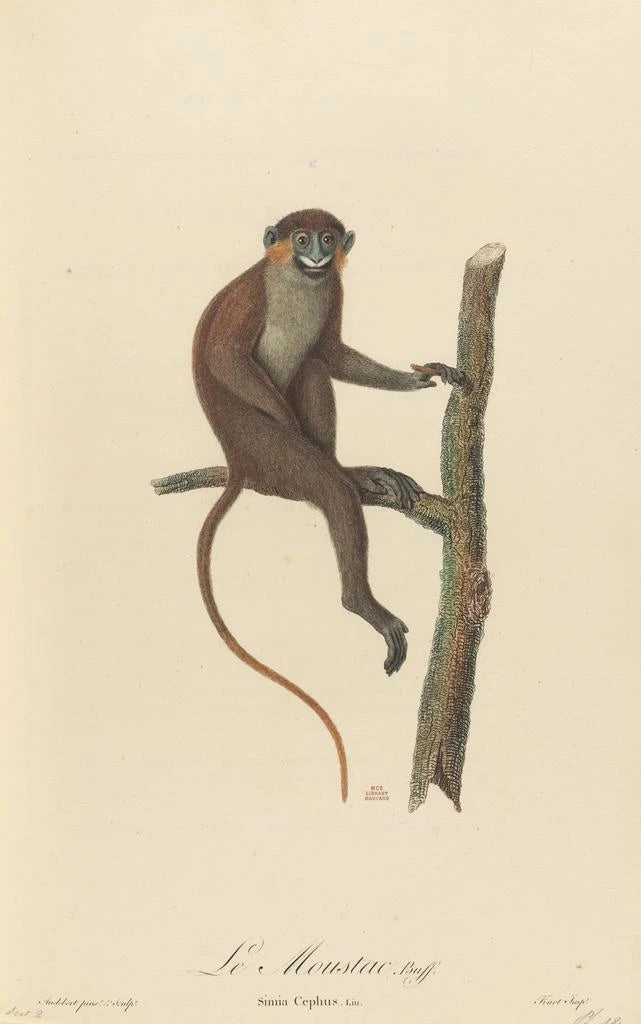 W tym fascynującym dziele Jean-Baptiste Audebert przedstawia Moustaca, ikonicznego zwierzęcia Madagaskaru. Obraz charakteryzuje się jaskrawymi kolorami i precyzyjną techniką, ukazującą teksturę sierści i żywe wyrazy zwierzęcia. Atmosfera emanująca z tego dzieła jest jednocześnie dynamiczna i porywająca, zanurzając widza w bogaty świat madagaskiej fauny. Audebert, dzięki swojemu talentowi, potrafi uwiecznić ten moment życia, oferując okno na często nieznany świat zwierząt.