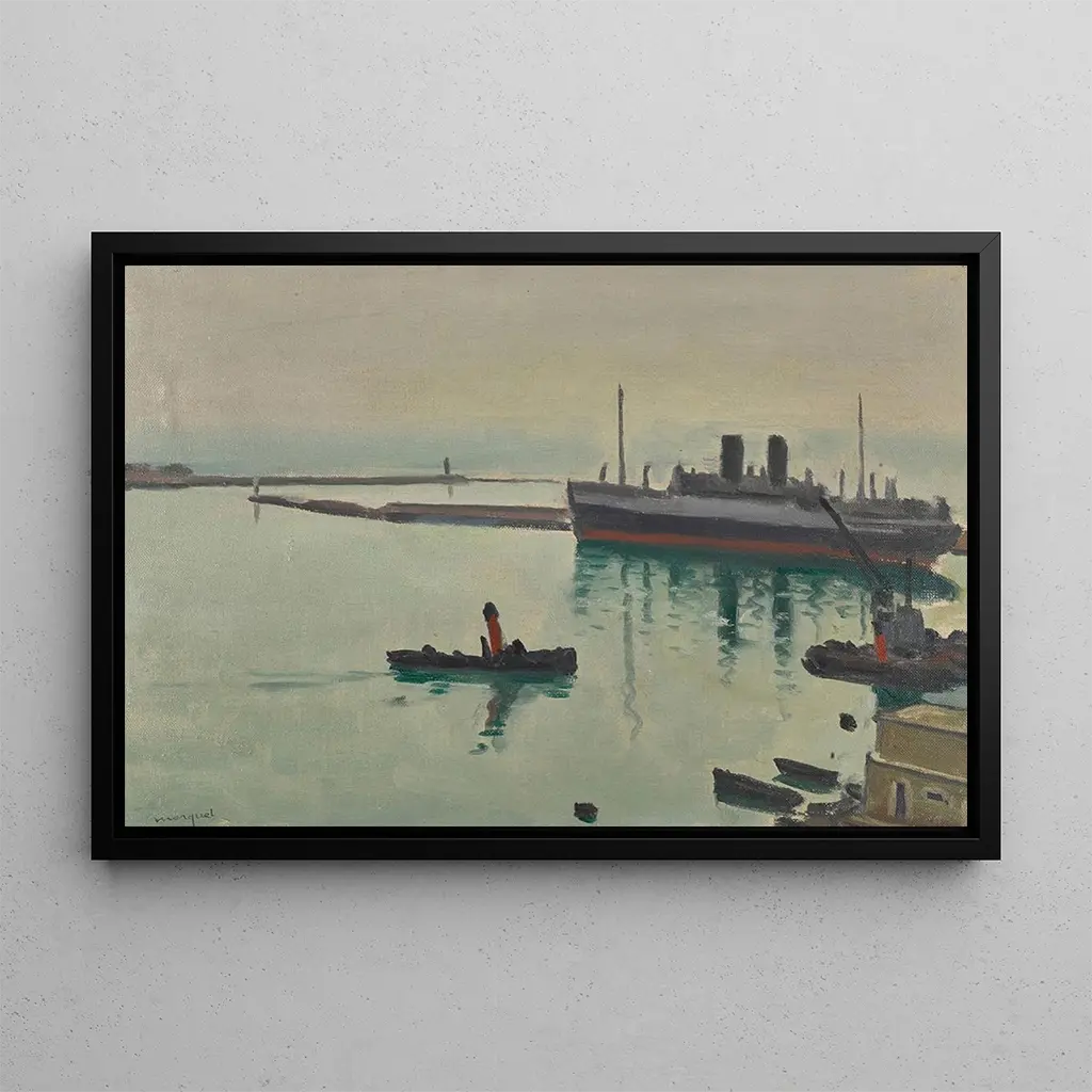 Druk artystyczny Le Paquebot autorstwa Alberta Marquet to dzieło, które przywołuje na myśl podróż i wolność. Z żywymi kolorami i harmonijną kompozycją, Marquet uchwycił esencję wielkich liniowców tamtej epoki. Odcienie niebieskiego i białego przenikają się, tworząc atmosferę zarówno spokojną, jak i dynamiczną, zachęcając widza do wyobrażenia sobie odległych horyzontów. Technika artysty, charakteryzująca się płynnymi pociągnięciami pędzla, ożywia scenę morską, zamieniając obraz w otwarte okno na ocean. Każdy szczegół, od śladu fal po żagle napędzane wiatrem, przyczynia się do odczucia ucieczki.