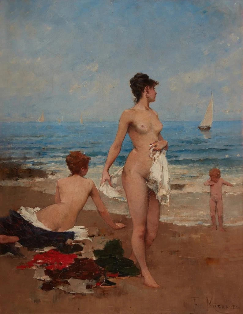 Francesc Miralles i Galaup, kataloński artysta XIX wieku, jest często uznawany za mistrza łączenia realizmu z impresjonizmem. Jego kariera naznaczona jest nieustannym dążeniem do piękna i harmonii, tematy, które głęboko rezonują w "Les Baigneuses". Pod wpływem wielkich mistrzów swojej epoki, Miralles wypracował własny styl, który pozwala mu się wyróżnić w świecie sztuki. Jego dzieła, często inspirowane naturą i codziennym życiem, odzwierciedlają unikalną wrażliwość, która porusza serca widzów. Poprzez swoje malarstwo, zachęca do refleksji nad kondycją ludzką, efemerycznym pięknem prostych chwil i magią relacji międzyludzkich. Wpływ jego pracy odczuwalny jest poza jego epoką, inspirując wielu