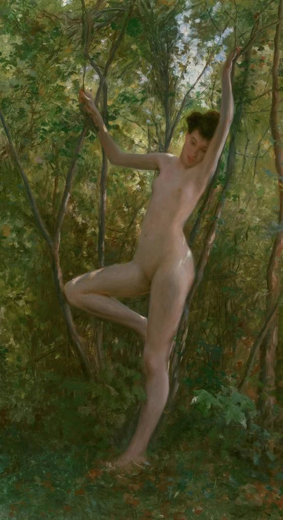 W "Nymfie leśnej" Julius LeBlanc Stewart przenosi nas do zaczarowanego świata, gdzie piękno natury łączy się z kobiecą gracją. Kompozycja dominuje w odcieniach zieleni i brązu, nawiązując do bujającego lasu. Delikatne światło przenika przez liście, tworząc spokojną i niemal mistyczną atmosferę. Nymfa, ubrana w lekką suknię, zdaje się tańczyć z cieniami i światłami, ucieleśniając ducha natury. Technika Stewarta, łącząca realizm z impresjonizmem, ożywia każdy szczegół — od delikatnych liści po refleksy na skórze centralnej postaci, zachęcając widza do dłuższej kontemplacji.