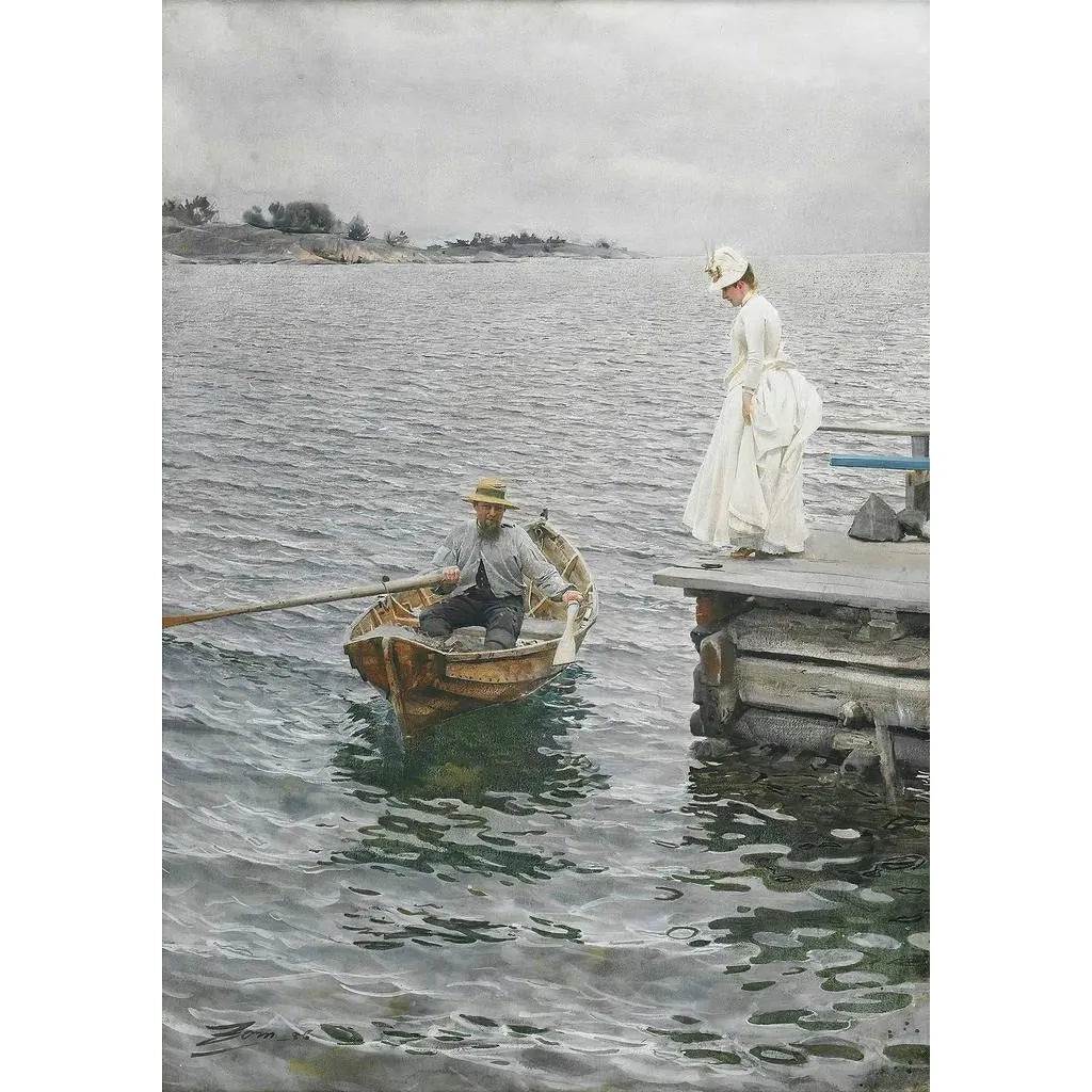„Sommarnje” to ikoniczne dzieło Andersa Zorna, które przywołuje ciepło i piękno szwedzkiego lata. Dzięki złotym odcieniom i niuansom niebieskiego, Zorn przedstawia żywą scenę, w której światło słońca tańczy na wodzie, tworząc czarujący efekt odbić. Postacie ludzkie, zanurzone w tym świetle, zdają się rozkwitać w otaczającej naturze, ukazując prostą radość letnich przyjemności. Technika Zorna, łącząca realizm z impresjonizmem, nadaje tej płótnie atmosferę zarówno intymną, jak i uniwersalną, zachęcając do nostalgii za słonecznymi dniami.