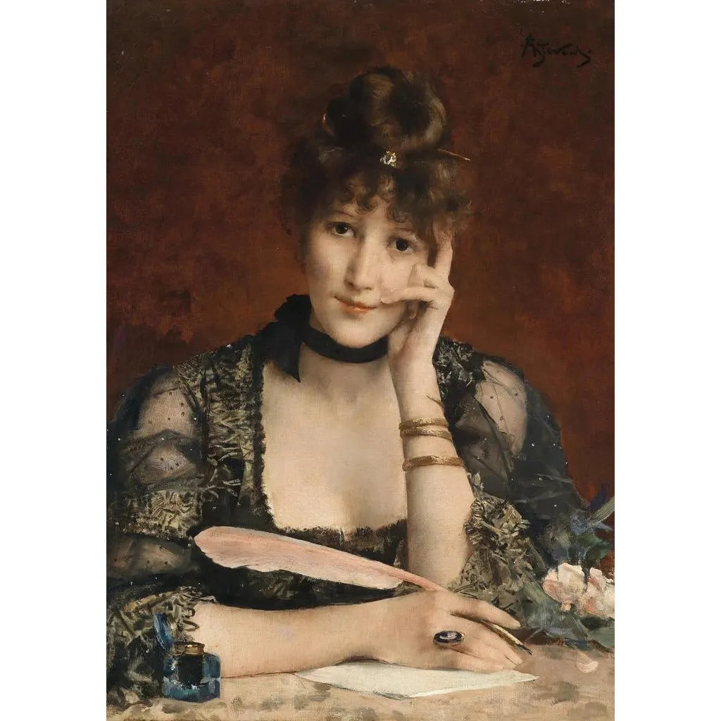 Alfred Stevens, belgijski artysta XIX wieku, jest znany ze swojej zdolności do opowiadania historii poprzez swoje dzieła. Pod wpływem realizmu i impresjonizmu, potrafił tworzyć obrazy łączące piękno i emocje. Jego tematy, często kobiety w intymnych sytuacjach, ukazują wyjątkową wrażliwość i szczególną uwagę na detale. "La lettre" wpisuje się w tę tradycję, ilustrując nie tylko techniczną biegłość Stevensa, ale także jego zainteresowanie relacjami międzyludzkimi i momentami życia. Jego prace nadal inspirują i fascynują, świadcząc o znaczeniu sztuki w rozumieniu emocji ludzkich.