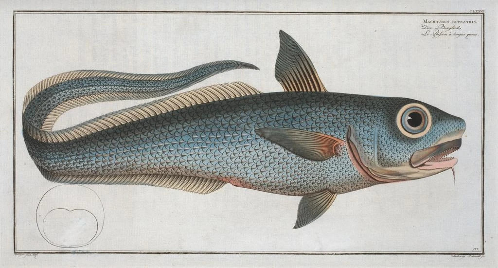 Druk artystyczny Macrourus rupestris, wykonany przez Marcusa Eliesera Blocha, przenosi nas do fascynującego świata wodnego. Ten obraz podkreśla szczegóły tego ryby z głębin, z kolorami od głębokiego niebieskiego po srebrzystą szarość, nawiązując do światła przenikającego pod wodą. Technika akwaforty pozwala oddać teksturę skóry ryby w niemal namacalny sposób, tworząc atmosferę zarazem tajemniczą i porywającą. Dzieło zachęca do uważnej kontemplacji, ukazując ukryte piękno morskich stworzeń.