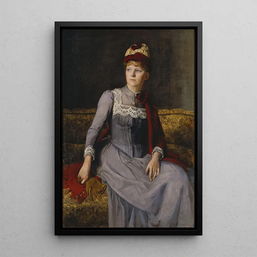 Druk artystyczny Madame Anna Flensburg, wykonany przez Minę Carlson-Bredberg, przywołuje atmosferę gracji i delikatności. Kompozycja przedstawia urzekający portret, gdzie szczegóły ubrań i akcesoriów ukazują staranność i dbałość o detale. Delikatne kolory, dominujące odcieniami pastelowymi, tworzą harmonijną wizualną całość, która zachęca do kontemplacji. Technika malarstwa olejnego nadaje teksturę bogatą i głębię, dzięki czemu twarz modelki jest szczególnie żywa. To dzieło, jednocześnie intymne i uniwersalne, przenosi nas w zawieszony moment, w którym kobieca piękność jest celebrowana z czułością.