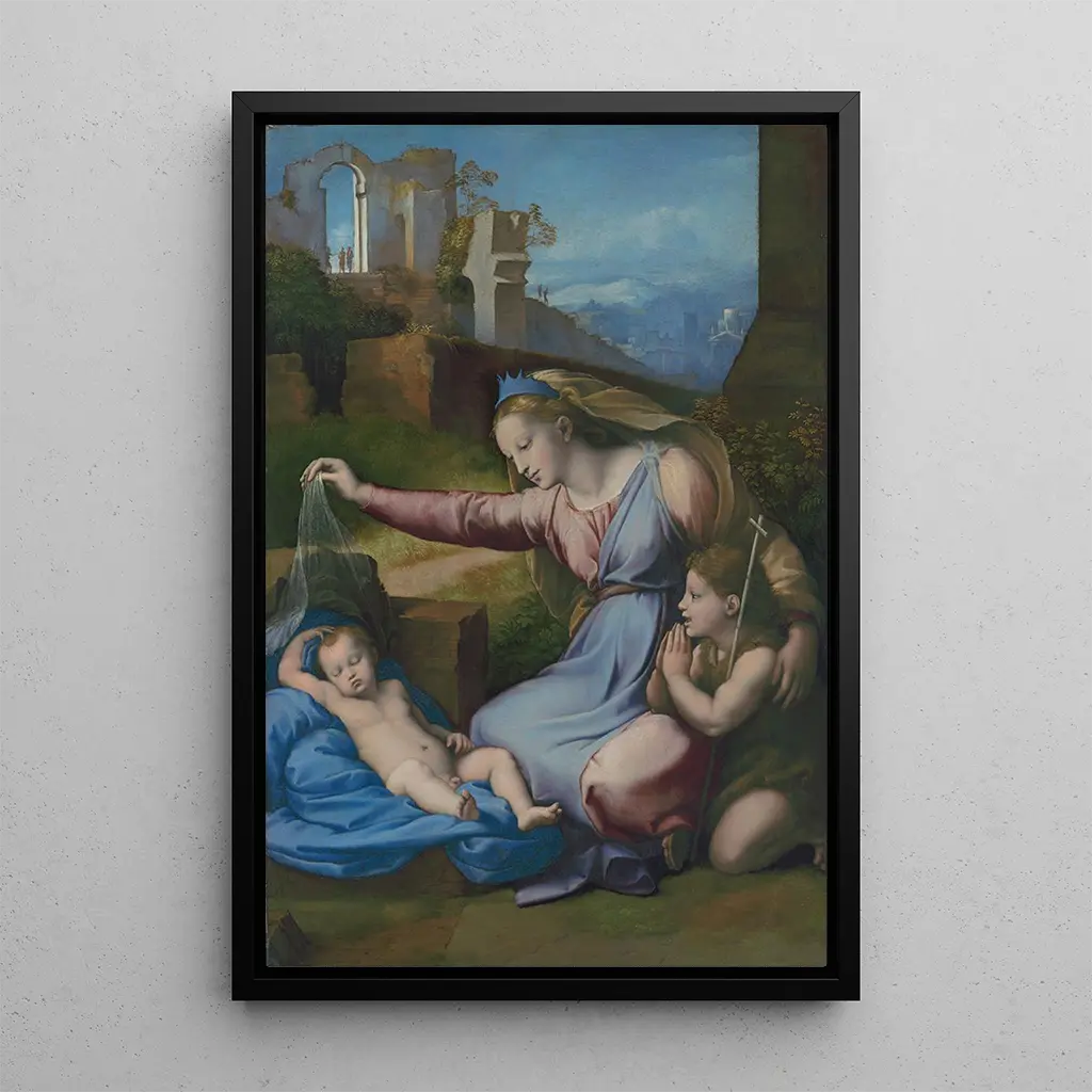 La Madona z błękitnym diadémem, ikoniczne dzieło Rafaela, jest wybitnym przedstawieniem Dziewicy Maryi, koronowanej niebiańskim pięknem. Odcienie głębokiego niebieskiego i złota zdobiące diadém delikatnie kontrastują z ciepłymi tonami ciała, tworząc atmosferę jednocześnie majestatyczną i intymną. Postawa Dziewicy, delikatnie trzymającej Dzieciątko Jezus, wywołuje duchowe i ludzkie połączenie, podczas gdy wyrafinowane detale draperii i twarzy dodają głębi emocjonalnej tej reprodukcji. To dzieło ucieleśnia harmonię i pokój, cechy charakterystyczne stylu Rafaela.