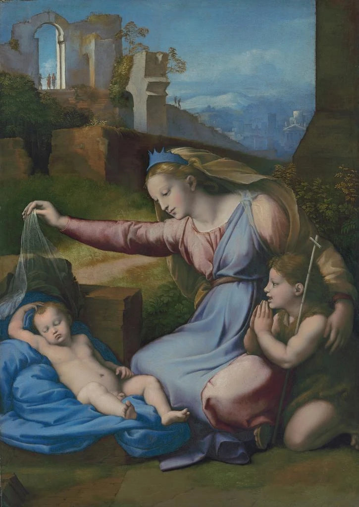 Rafael, urodzony w 1483 roku, jest jednym z najbardziej wpływowych artystów włoskiego renesansu. Jego dzieło, naznaczone dążeniem do perfekcji i harmonii, zostało ukształtowane przez jego interakcje z innymi wielkimi mistrzami epoki. La Madona z błękitnym diadémem, namalowana około 1506 roku, doskonale odzwierciedla jego unikalny styl, łącząc realizm i idealizację. To dzieło świadczy o znaczeniu przedstawiania Dziewicy w sztuce chrześcijańskiej, jednocześnie odzwierciedlając wartości humanistyczne renesansu, gdzie jednostka i duchowość są na pierwszym planie.