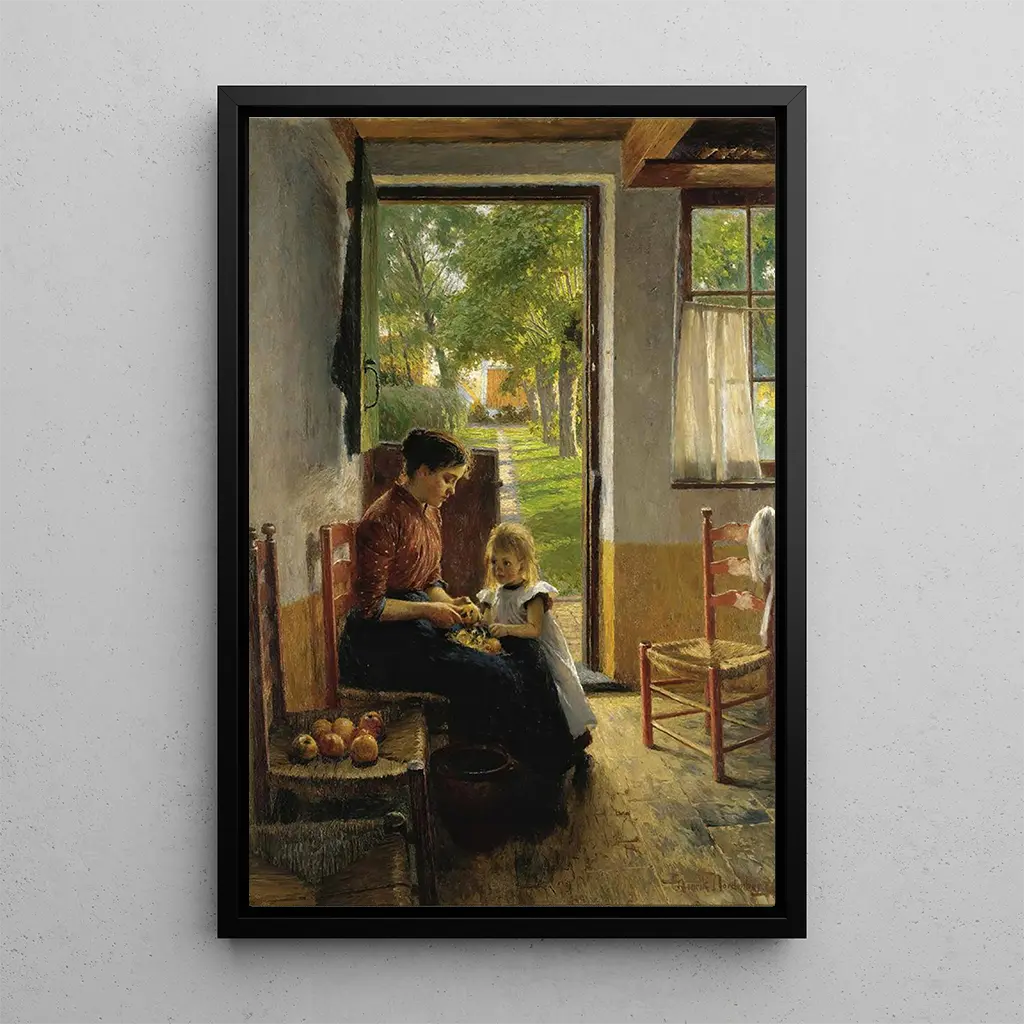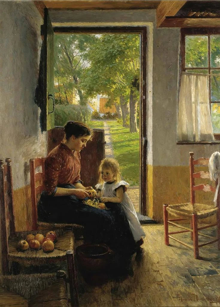 Dans "Le petit assistant de maman", Henrik Nordenberg capture la douceur de l’enfance à travers une composition délicate. Le tableau dépeint un jeune garçon, concentré sur ses tâches, entouré d’une palette de couleurs chaudes et apaisantes. Les nuances de brun et de jaune créent une atmosphère chaleureuse, tandis que la lumière douce qui éclaire le visage du petit protagoniste évoque une sensation de sérénité. La technique de Nordenberg, mêlant réalisme et impressionnisme, permet de ressentir la tendresse du moment, comme si l’on pouvait entendre les murmures de l’enfance et les rires lointains.