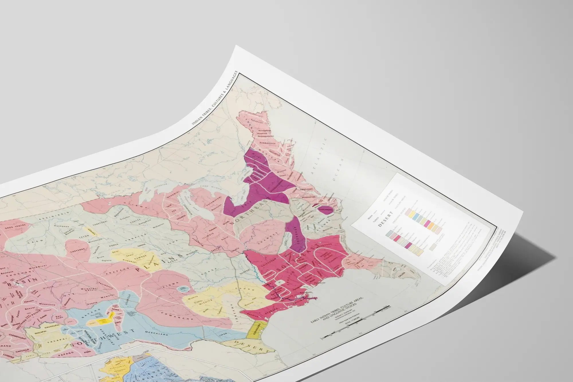 Mapa jest podzielona na kilka odrębnych obszarów kulturowych, w tym Północny Zachód, Płaskowyż, Wielkie Jeziora, Równiny, Południowy Zachód, Południowy Wschód, Północny Wschód oraz obszar pustynny. Każdy region oznaczony jest specyficznym kolorem, co ułatwia rozróżnienie terytoriów. Na przykład obszar Równin jest w jasnoróżowym odcieniu, podczas gdy Południowy Zachód w jasnoniebieskim, co czyni czytanie mapy intuicyjnym dla dekoratora dążącego do uporządkowanej kompozycji wizualnej.