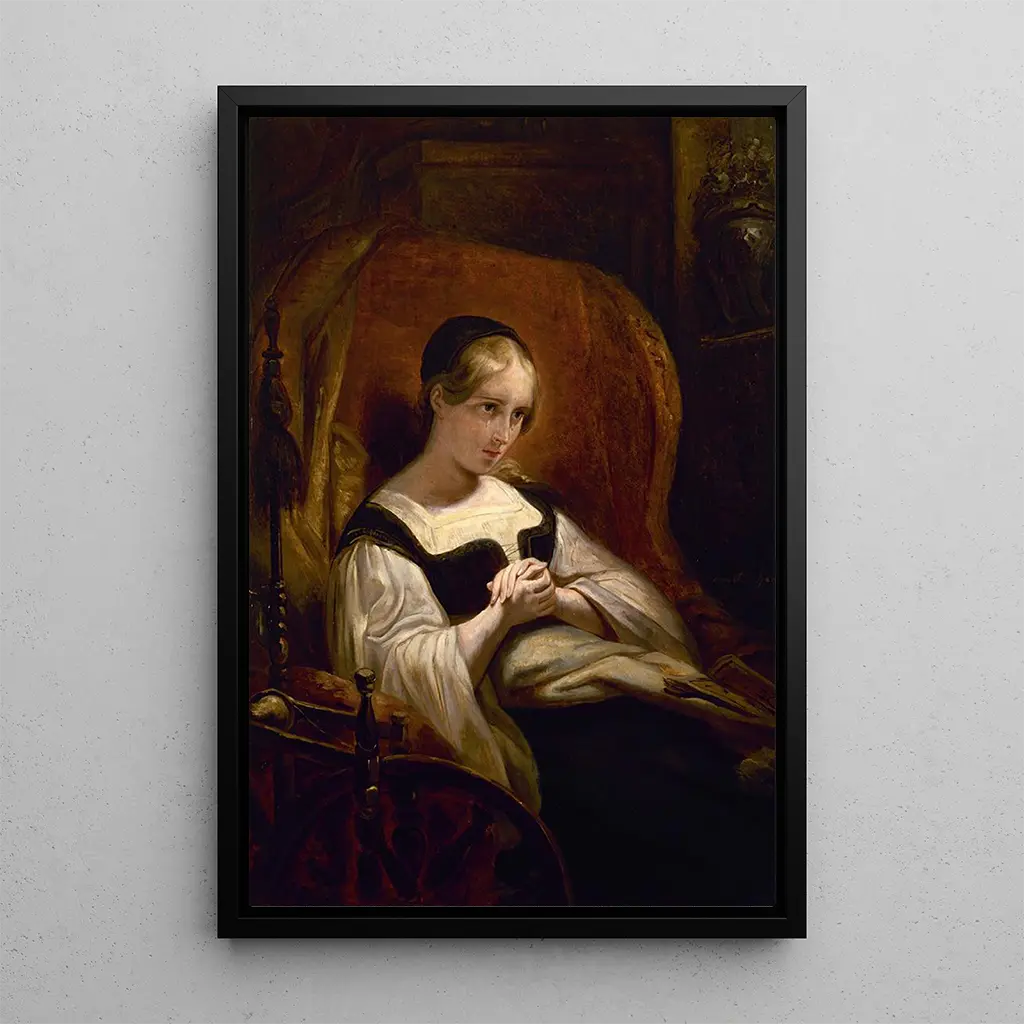 W tej druk artystyczny przedstawiającej Marguerite przy kołowrotku, Ary Scheffer uchwycił intymny i subtelny moment, w którym światło gra na teksturach ubrań i włosów. Kompozycja, skoncentrowana na postaci Marguerite, wywołuje atmosferę spokoju i koncentracji. Delikatne kolory, łączące ciepłe i chłodne odcienie, tworzą harmonijną równowagę, która przyciąga wzrok. Technika Scheffera, zarówno precyzyjna, jak i ekspresyjna, ożywia tę scenę codziennego życia, gdzie gest przędzenia staje się metaforą cierpliwości i kreatywności.