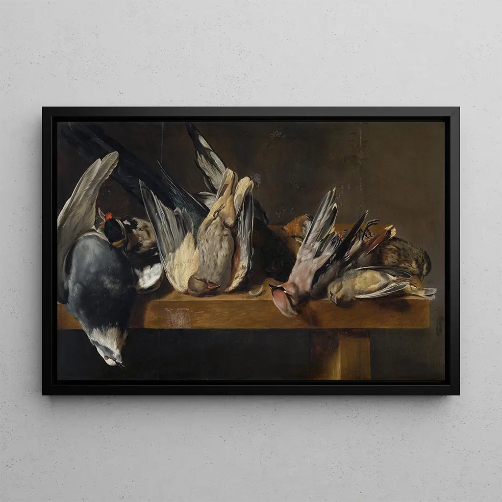 Druk artystyczny Oiseaux morts autorstwa Elias Vonck przenosi nas do świata, gdzie piękno i melancholia się spotykają. To dzieło, bogate w szczegóły, przedstawia starannie skomponowaną scenę ptaków, ukazując kruchość życia. Ciemne, ziemiste kolory, połączone z akcentami światła, tworzą atmosferę zarówno realistyczną, jak i kontemplacyjną. Technika chiaroscuro, charakterystyczna dla artysty, podkreśla dramat sceny, zachęcając widza do refleksji nad śmiertelnością i ulotnym pięknem natury.