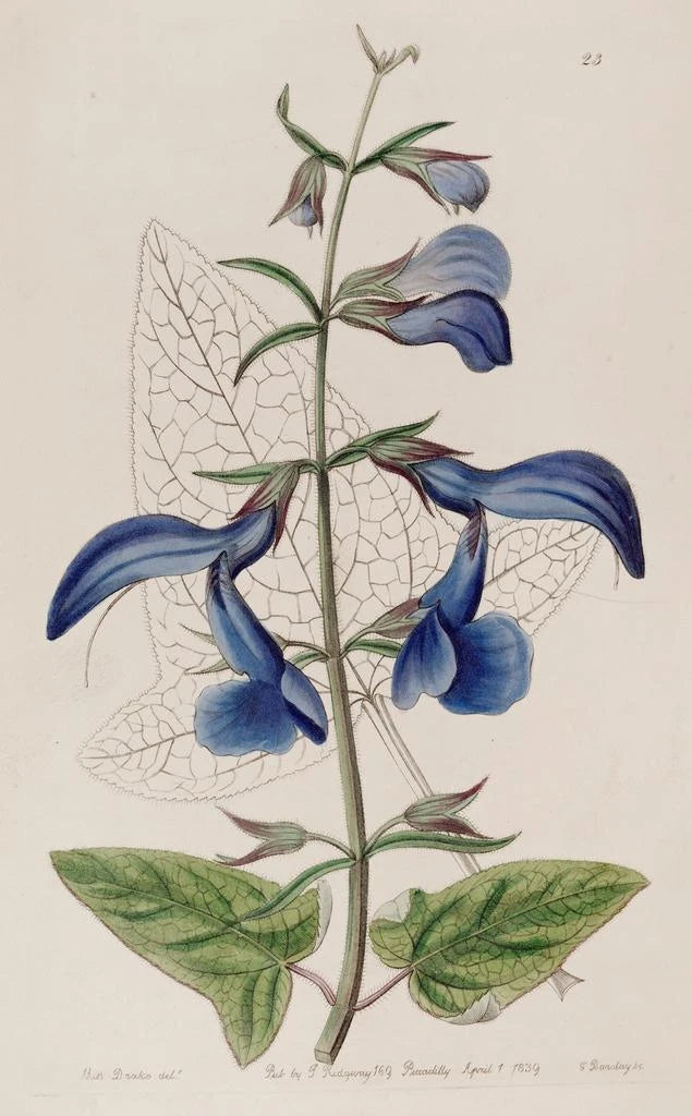 Obraz Mexikańskiej szałwii z dużymi niebieskimi kwiatami - Sydenham Edwards | Druk artystyczny
