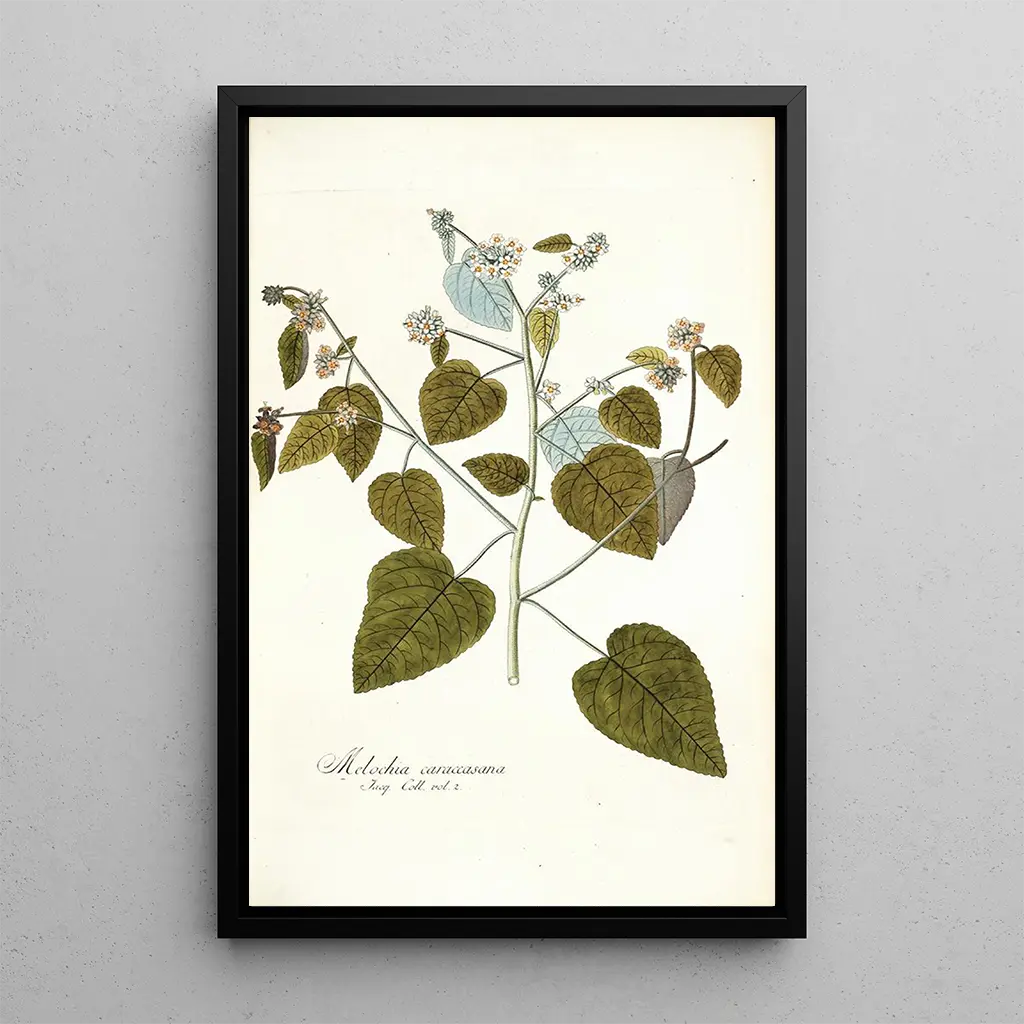 Druk artystyczny Melochia caraccasana, wykonany przez Nikolausa Josefa Freiherr von Jacquina, przenosi nas w bogaty i pełen życia świat roślinny. To dzieło, charakteryzujące się odcieniami zieleni i delikatnymi niuansami żółci, przywołuje ciepło klimatów tropikalnych. Technika akwareli, użyta z finezją, pozwala oddać lekkość i przejrzystość liści. Atmosfera emanująca z tego płótna jest jednocześnie uspokajająca i inspirująca, zachęcając widza do zanurzenia się w bujnej naturze i docenienia piękna detali botanicznych.