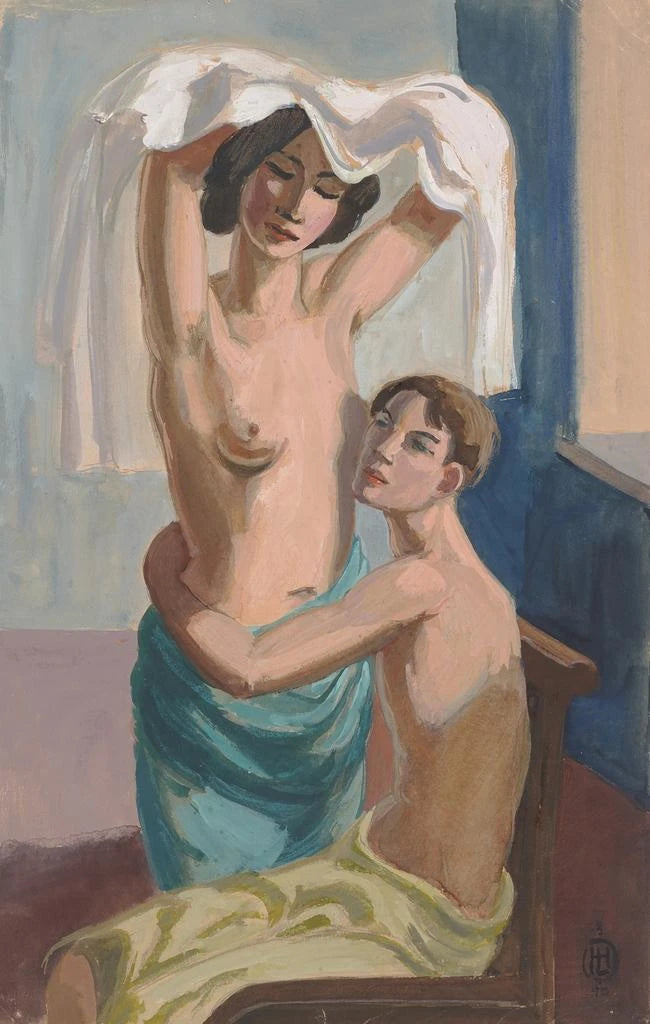 Druk artystyczny | Mężczyzna nagi siedzący obejmujący nagą kobietę stojącą - Hermann Lismann