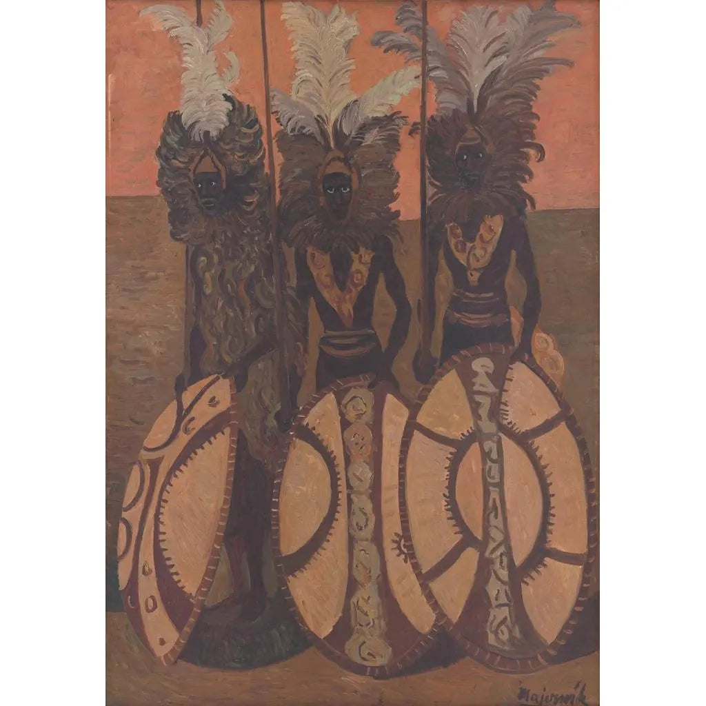 Cyprian Majernik, actif au XXe siècle, est reconnu pour son engagement envers les thèmes sociaux et culturels. Influencé par le mouvement expressionniste, il a cherché à exprimer les luttes et les triomphes des peuples à travers son art. Ses œuvres, dont Hommes noirs, reflètent une période de prise de conscience et de revendication des droits civiques, où l'art devient un vecteur de changement. Majernik a su capter l'essence de son époque, faisant de lui une figure importante dans l'art contemporain, particulièrement en ce qui concerne les représentations de l'identité.