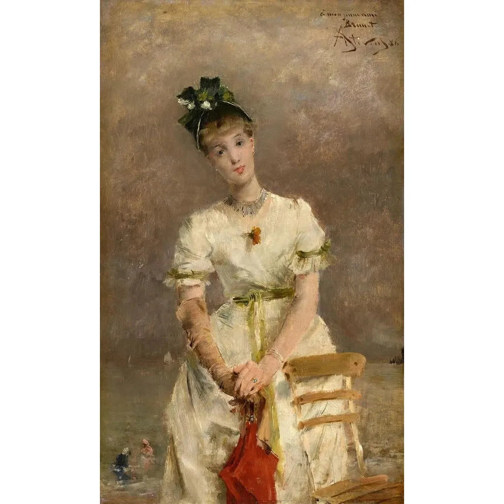 Dans cette reproduction de "Jeune femme au bord de la mer", Alfred Stevens capture une scène empreinte de douceur et de tranquillité. La composition met en avant une jeune femme, vêtue d'une robe légère, qui se tient près des vagues, son regard perdu dans l'horizon. Les couleurs pastel, dominées par des nuances de bleu et de beige, évoquent une atmosphère estivale apaisante. La technique de Stevens, caractérisée par un réalisme délicat, donne vie à la texture des vêtements et à la luminosité de la mer, créant ainsi une invitation à la contemplation et à l’évasion.