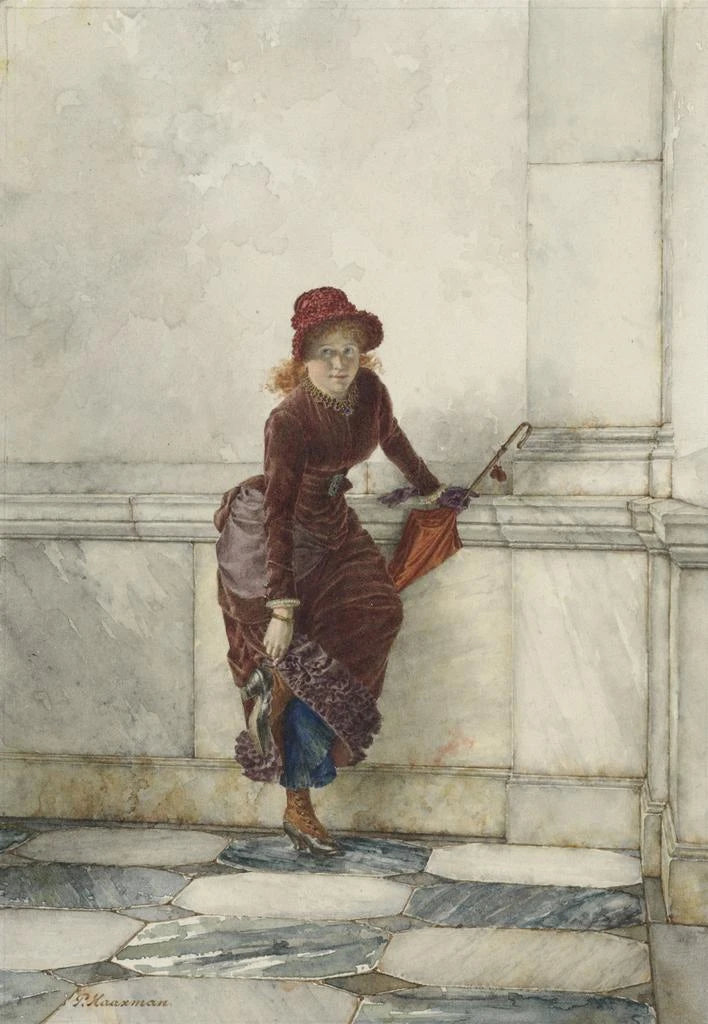 Dans cette reproduction de l'œuvre "Jeune femme debout appuyée contre un mur", l'artiste Pieter Haaxman capture un moment de tranquillité et de réflexion. La composition met en avant une jeune femme, élégamment vêtue, qui semble perdue dans ses pensées. Les couleurs douces et chaudes, mêlant des tons de terre et de pastel, créent une atmosphère apaisante. La lumière douce qui éclaire son visage accentue la délicatesse de ses traits, tandis que le mur en arrière-plan ajoute une dimension de profondeur à la scène. Cette œuvre invite à une contemplation silencieuse, comme si l'on pouvait partager un instant de vie avec la protagoniste.