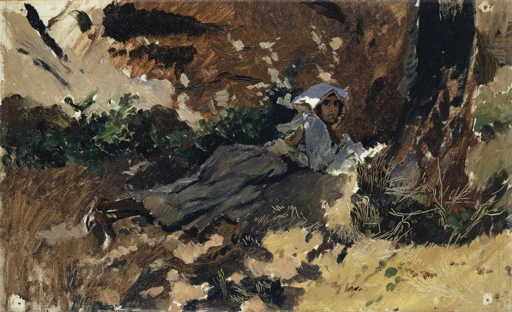 Młoda kobieta leżąca w lesie - Frank Buchser