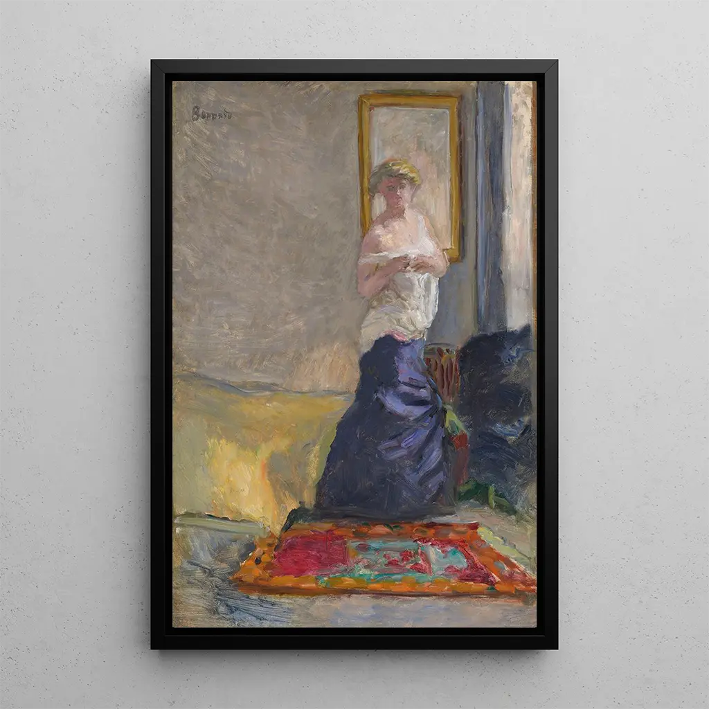Dans "Jeune femme se déshabillant", Pierre Bonnard nous plonge dans un moment d’intimité délicate, où la lumière caresse la peau de la modèle. La composition, à la fois simple et évocatrice, met en avant la beauté du corps féminin, tout en préservant une certaine pudeur. Les couleurs pastel et les jeux d’ombre créent une atmosphère douce et rêveuse, invitant le spectateur à partager ce moment de vulnérabilité. La technique de Bonnard, qui mêle touches de pinceau légères et couleurs éclatantes, confère à cette reproduction une dimension presque tactile, rendant l’œuvre vivante et immersive.