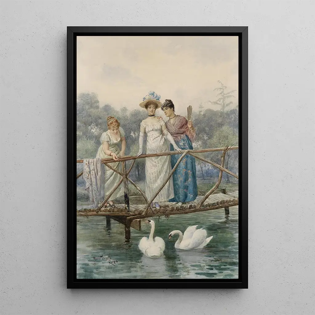 Dans la reproduction de l'œuvre "Jeunes femmes nourrissant des cygnes", Mario Spinetti capture un moment de douceur et d'harmonie avec la nature. Les couleurs pastel se mêlent délicatement, créant une atmosphère apaisante. Les jeunes femmes, vêtues de robes légères, semblent en communion avec les cygnes, symboles de grâce et de beauté. La technique de Spinetti, mêlant peinture à l'huile et touches impressionnistes, donne vie à cette scène bucolique, où chaque détail, du plumage des oiseaux aux expressions des femmes, est soigneusement travaillé pour évoquer une sensation de paix et de bonheur.