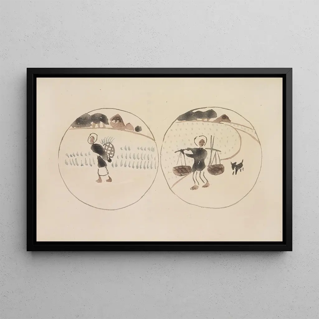 Druk artystyczny Mokugo zuansh Pl08 autorstwa Asai Chū przywołuje świat, w którym natura miesza się z abstrakcją. Delikatne odcienie zieleni i niebieskiego łączą się z akcentami złota, tworząc uspokajającą i kontemplacyjną atmosferę. Technika tuszu na papierze, typowa dla sztuki japońskiej, pozwala artyście bawić się światłem i cieniem, ożywiając pejzaż marzycielski. Każdy element kompozycji zdaje się tańczyć, zapraszając widza do zanurzenia się w tej poetyckiej scenie, gdzie czas wydaje się zawieszony.