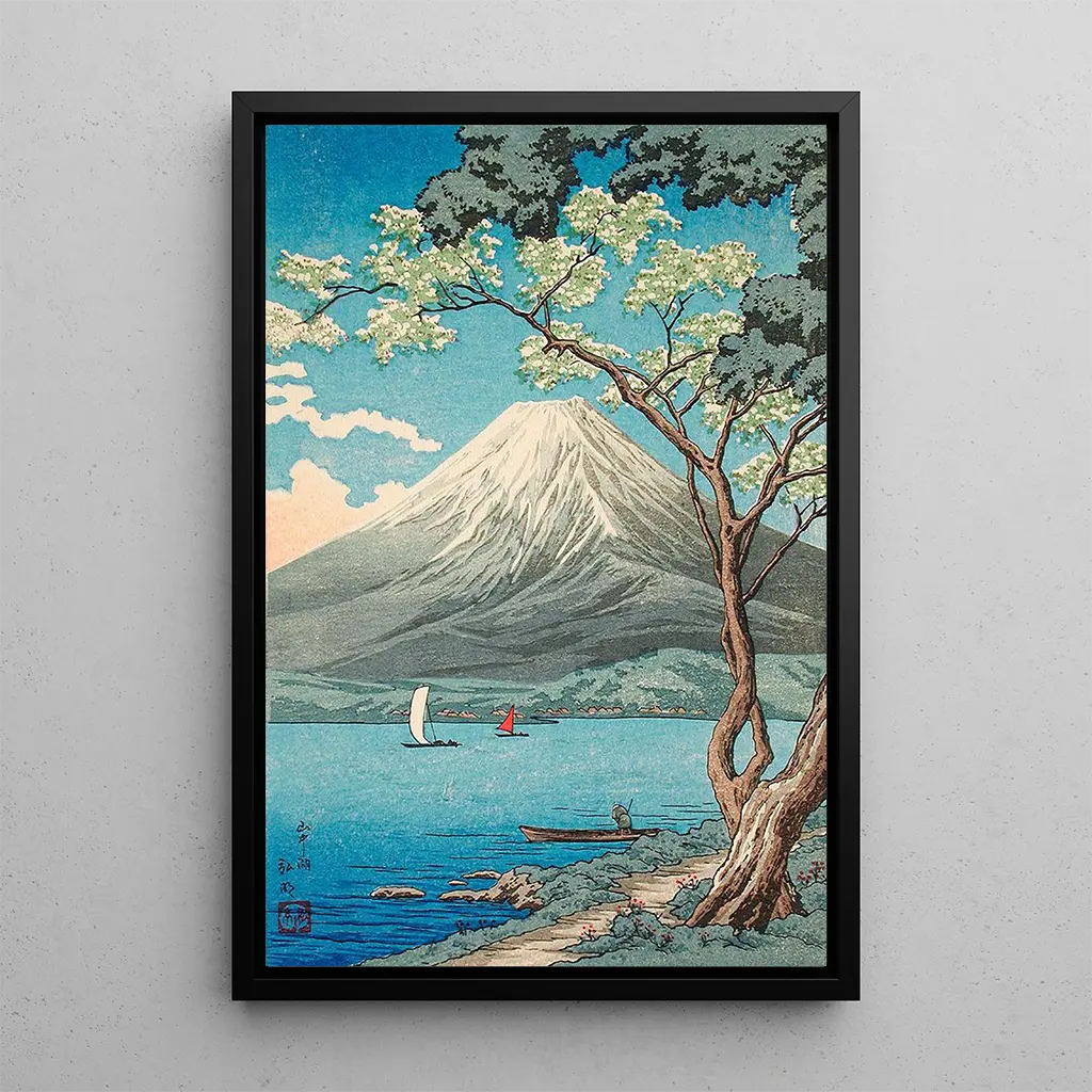 Druk artystyczny "Mont Fuji z jeziora Yamanaka" wywołuje majestatyczną ciszę. Delikatne odcienie nieba łączą się z srebrzystymi refleksami jeziora, podczas gdy Góra Fuji, symbol Japonii, wznosi się z gracją w tle. Technika Takahashi Hiroaki, znana z drzeworytów, nadaje temu dziełu głębię i unikalną fakturę. Spokojna atmosfera zachęca do kontemplacji, przenosząc widza w serce japońskiej natury, gdzie każdy szczegół zdaje się uchwycić esencję ulotnego momentu.