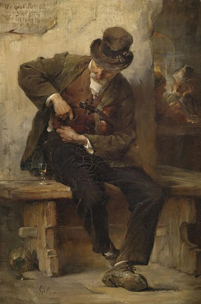 W "Muzyk uliczny przed zajazdem" Friedrich von Keller uchwycił istotę ożywionej sceny, gdzie muzyka i gościnność się spotykają. Obraz przedstawia muzyka, ubranego w tradycyjny strój, grającego na instrumencie przed przyjaznym zajazdem. Ciepłe, ziemiste kolory, połączone z akcentami złotego światła, tworzą ciepłą i radosną atmosferę. Drobne szczegóły twarzy przechodniów oraz elementy architektoniczne zajazdu dodają głębi tej pracy, zachęcając widza do zanurzenia się w codziennym życiu.