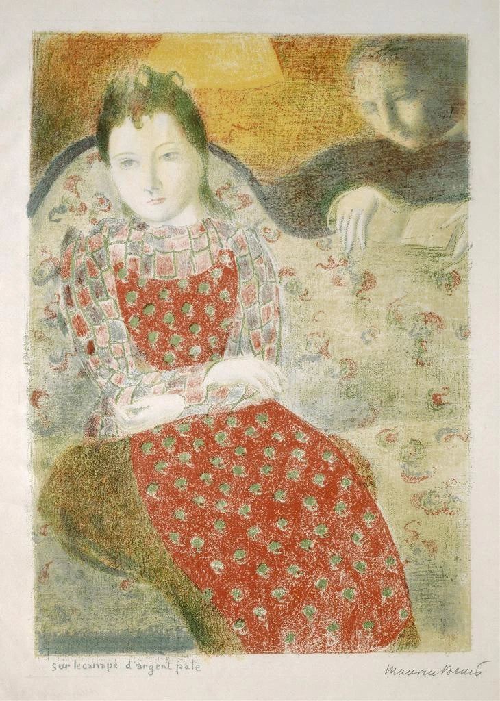 W tym dziele Maurice Denis przenosi nas w delikatny i poetycki świat. Obraz "Na jasnej, srebrzystej kanapie" wywołuje atmosferę spokoju i łagodności. Pastelowe kolory, zdominowane przez odcienie srebrzyste i akcenty różu, tworzą intymną przestrzeń, w której światło zdaje się muskać kształty. Kompozycja, skoncentrowana na kobiecej postaci siedzącej, zachęca do kontemplacji i marzeń. Motywy kwiatowe i delikatne tekstury wzmacniają to wrażenie spokoju, czyniąc ten druk artystyczny prawdziwą oazą wizualnego spokoju.