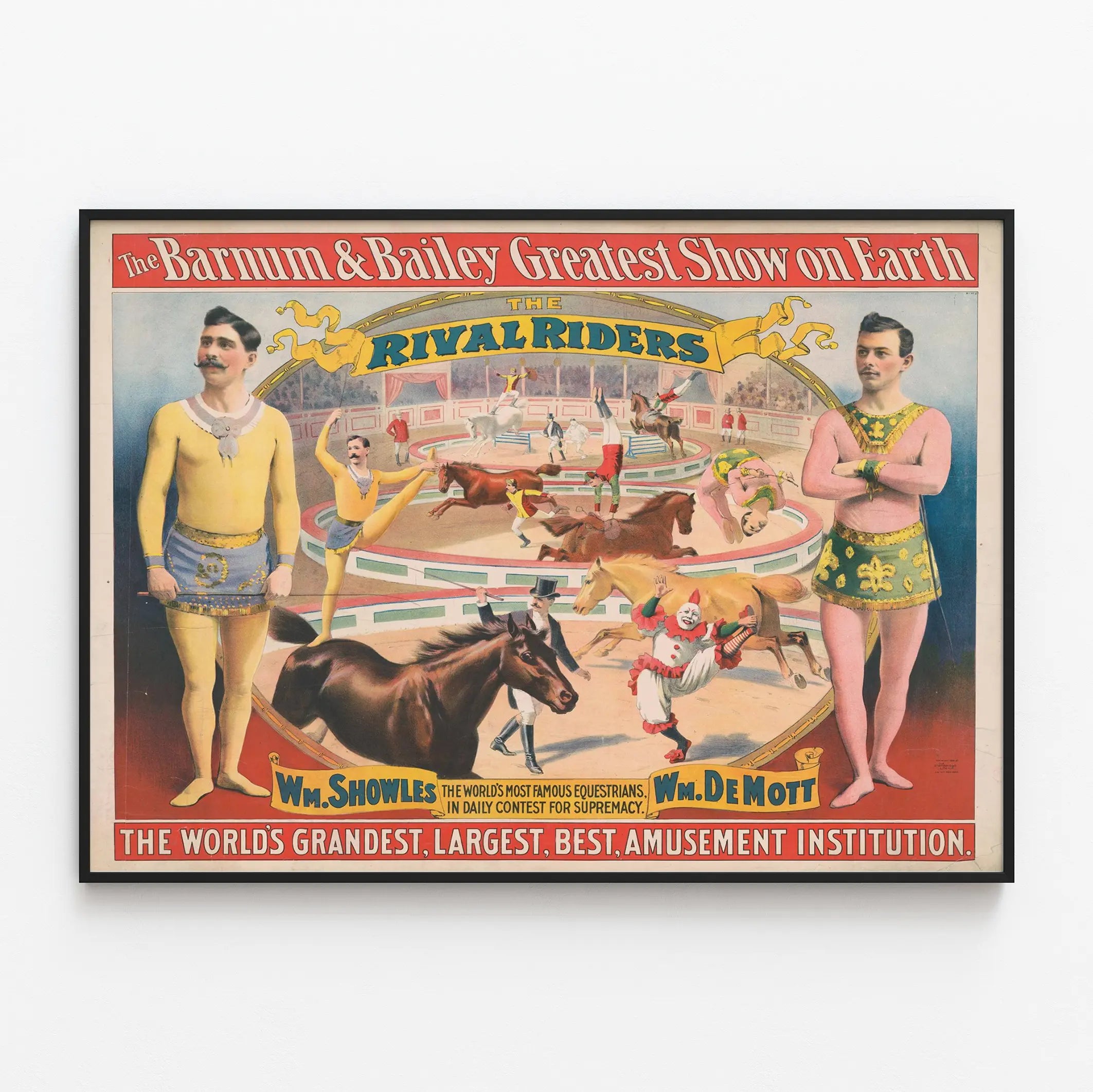 Odkryj tę ikoniczną plakatową reprodukcję vintage zatytułowaną "The Barnum & Bailey Greatest Show on Earth", przedstawiającą "The Rival Riders", spektakularne występy jeździeckie. Ten plakat dekoracyjny na ścianę prezentuje słynnych jeźdźców Wm. Showles i Wm. De Mott, uznawanych za najbardziej znanych na świecie, rywalizujących o dominację w fascynującym codziennym pokazie. Plakat oddaje unikalną atmosferę wielkich jarmarków i tradycyjnych cyrków, z szczegółowymi ilustracjami jeźdźców wykonujących akrobacje na ruchomych koniach w arenie. Obraz zawiera także ożywionego klauna, dodając scenie odrobinę fantazji i animacji. Idealny jako vintage'owa dekoracja ścienna, ten plakat wniesie do wnętrza klimat retro i świąteczny, doskonały dla miłośników cyrku, historii sztuki widowiskowej lub po prostu do wzbogacenia przestrzeni poświęconej światu artystycznemu, pełnemu wizualnej eksploracji i nostalgii. Ten dekoracyjny obraz o staroświeckim wyglądzie, z ciepłymi barwami i postaciami w kostiumach z epoki, jest także dziełem sztuki wizualnej opowiadającym ważną część historii rozrywek popularnych. Jego styl graficzny i kompozycja czynią go wyróżniającym się i atrakcyjnym elementem kolekcji plakatów lub oryginalnej dekoracji ściennej. Wybierz ten plakat Barnum & Bailey, aby dodać autentyczności i charakteru swojej aranżacji wnętrza.
