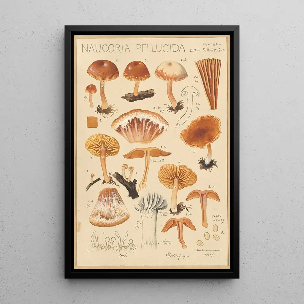 Druk artystyczny Naucoria pellucida przenosi nas do świata, w którym kruchość grzybów łączy się z pięknem natury. Delikatne i przejrzyste odcienie tego dzieła przywołują światło przenikające przez liście, tworząc spokojną i kontemplacyjną atmosferę. Technika Hansa Baldunga, z jej drobiazgowymi detalami i mistrzostwem w cieniach, ożywia tę subtelną scenę, zachęcając widza do docenienia efemerycznego piękna tych fascynujących organizmów. Każdy element kompozycji wydaje się opowiadać historię, hołd dla natury i jej cudów.