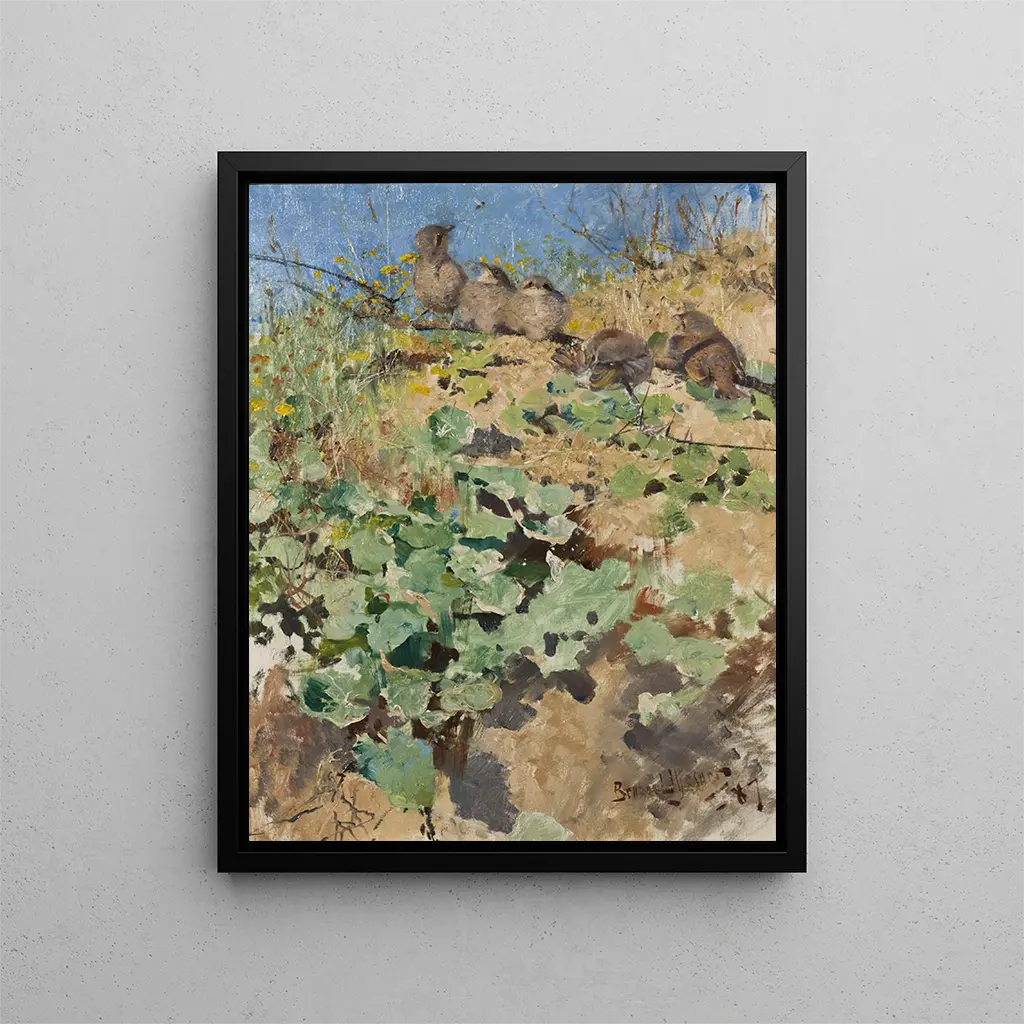 Styl Liljeforsa charakteryzuje się harmonijnym połączeniem realizmu i impresjonizmu, gdzie każdy pociągnięcie pędzla zdaje się opowiadać historię. W "Gniazdach pliszka drączyka" światło odgrywa kluczową rolę, oświetlając delikatne pióra ptaka i tworząc subtelne cienie, które dodają głębi scenie. Paleta kolorów, bogata i niuansowana, odzwierciedla ciepło krajobrazów północnych, podczas gdy precyzja szczegółów, od źdźbeł trawy po tekstury piór, świadczy o dokładnym obserwowaniu natury. Liljefors potrafi uchwycić nie tylko fizyczny wygląd swoich modeli, ale także ich istotę, ich charakter. To dzieło jest prawdziwą hołd dla dzikiego życia, gdzie każdy element przyczynia się do zrównoważonej i harmonijnej kompozycji.