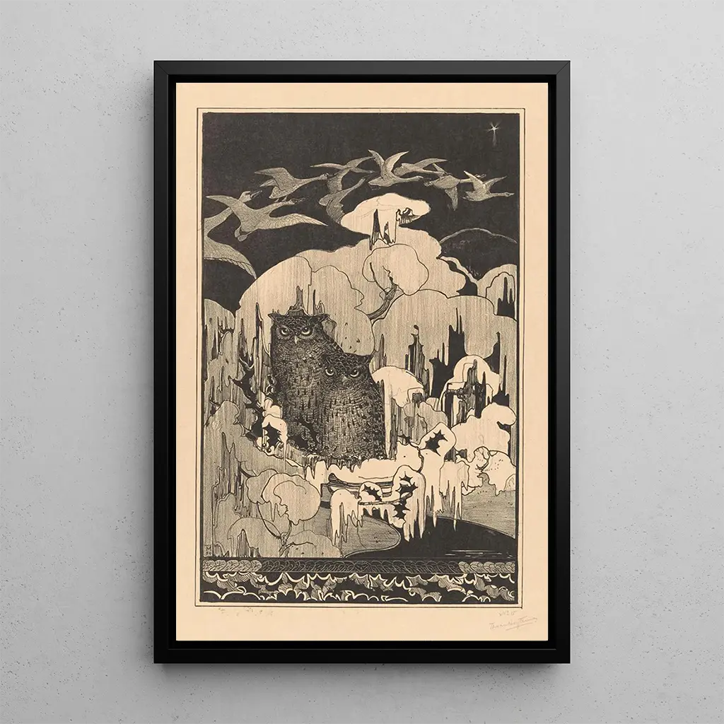 La druk artystyczny de "Nuit de Noël" de Theo van Hoytema évoque une atmosphère paisible et féerique. Les teintes sombres du ciel étoilé se mêlent à des éclats de lumière douce, créant un contraste captivant. La technique de l’artiste, qui combine aquarelle et huile, donne vie à une scène où la nature et l’architecture s’entrelacent harmonieusement. Les silhouettes des arbres et des maisons, délicatement éclairées, invitent à la contemplation et à la rêverie, faisant de cette toile un véritable poème visuel sur la magie des nuits d’hiver.