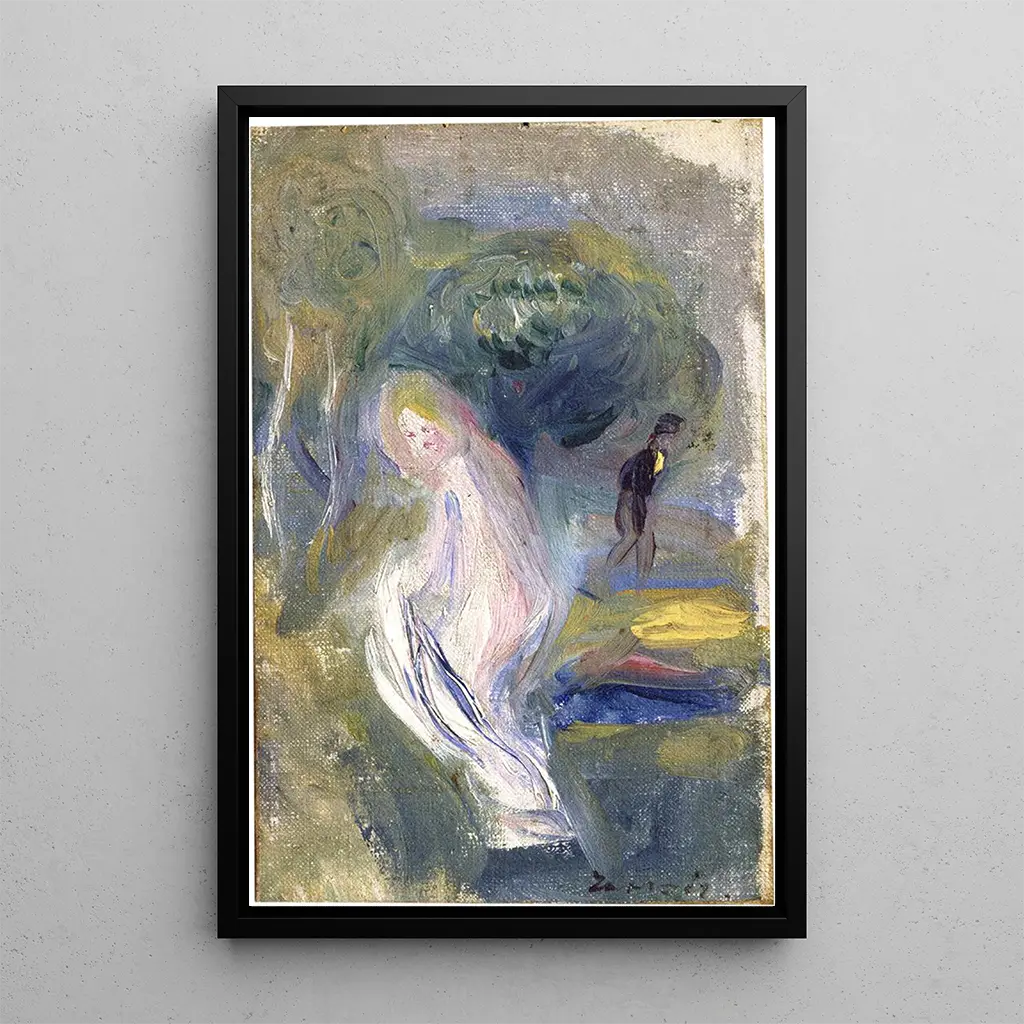W tym urzekającym dziele Pierre-Auguste Renoir przenosi nas do świata, w którym piękno ludzkiego ciała łączy się z delikatnością intymnej sceny. Zmysłowe krzywizny aktu, skąpane w miękkim świetle, wywołują atmosferę spokoju i zmysłowości. Ciepłe kolory, od odcieni ciała po złote tonacje, tworzą wizualną harmonię przyciągającą wzrok. Figura w tle, subtelnie szkicowana, dodaje narracyjny wymiar kompozycji, wzmacniając ideę dzielonej intymności. To płótno, prawdziwe arcydzieło impresjonistyczne, zachęca do kontemplacji i ucieczki.
