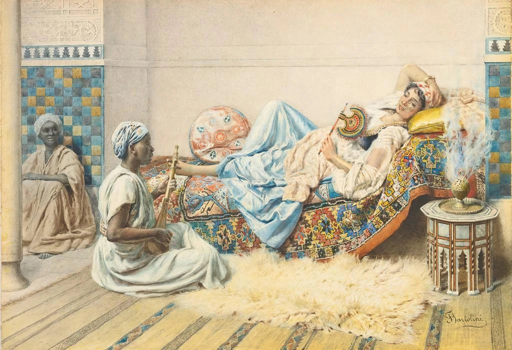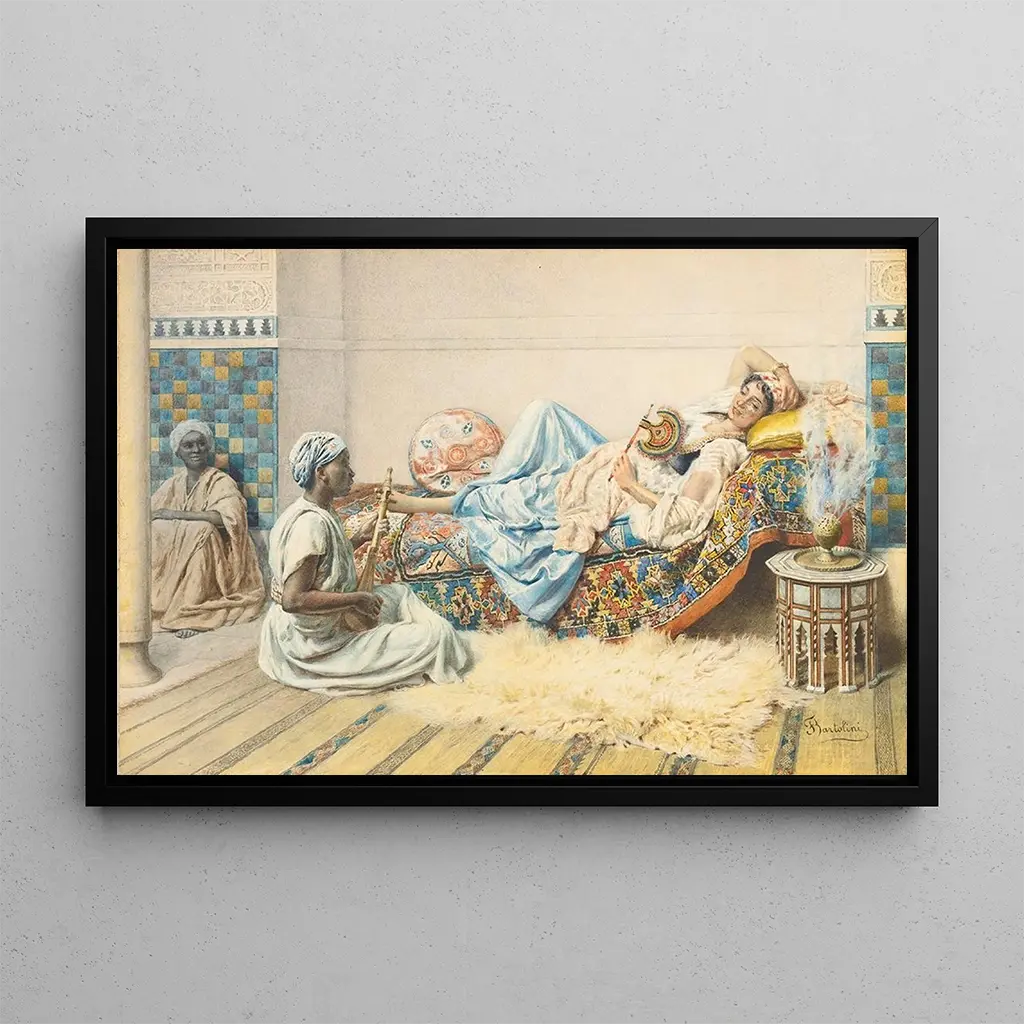 L'Odalisque, ikoniczne dzieło Federico Bartolini, przywołuje delikatną sensualność i marzenie o Orientu. Kompozycja przedstawia leżącą kobietę, otoczoną luksusowymi draperiami i egzotycznymi motywami. Bogate kolory, od ciepłych tonów po głębokie odcienie, tworzą intymną i tajemniczą atmosferę. Technika Bartolini, charakteryzująca się płynnymi pociągnięciami pędzla i szczególną dbałością o detale, ożywia tę postać kobiecą, jednocześnie przekazując wrażenie spokoju i harmonii. To płótno zachęca do kontemplacji i ucieczki w świat piękna.