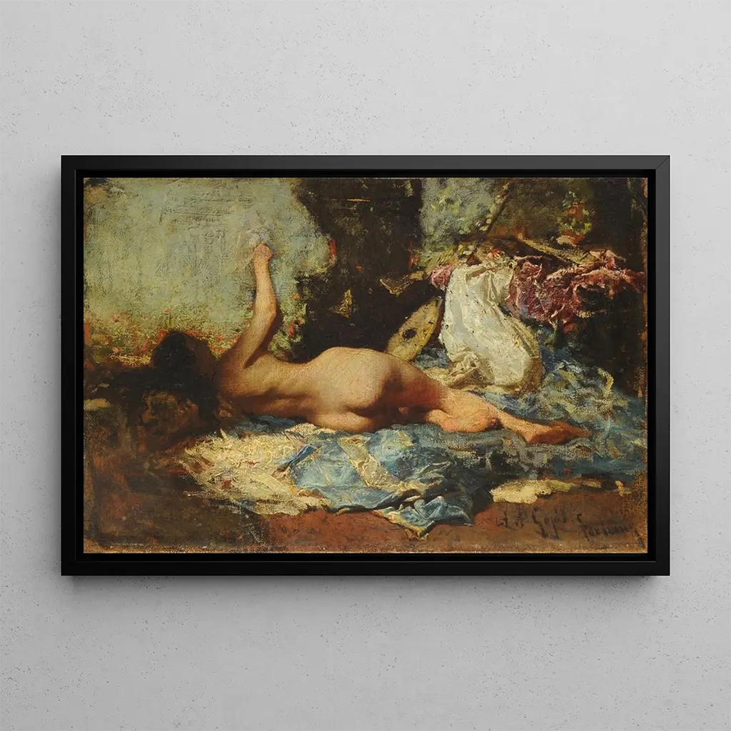 L'druk artystyczny de Mariano Fortuny Marsal est une œuvre qui transporte le spectateur dans un univers de sensualité et d'exotisme. La composition met en avant une femme allongée, drapée dans des tissus riches et colorés, qui évoquent les mille et une nuits. Les couleurs chaudes et vibrantes, allant des rouges profonds aux ors chatoyants, créent une atmosphère à la fois intime et envoûtante. La technique de Fortuny, mêlant peinture à l'huile et influences orientales, donne vie à des textures délicates, rendant presque palpable la douceur de la peau de l'odalisque. Ce tableau, véritable invitation à la contemplation, suscite des émotions profondes et un sentiment de désir.