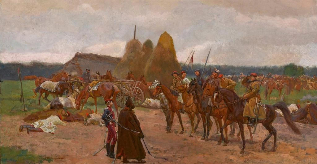 "Epizod powstania" Józefa Chełmońskiego to potężne dzieło, które oddaje intensywność chwili buntu. Obraz, bogaty w szczegóły i emocje, przedstawia dramatyczną scenę, na której postacie są zamrożone w zaciekłej walce. Ciemne kolory i uderzające kontrasty podkreślają napięcie kompozycji, podczas gdy technika Chełmońskiego, łącząca realizm z ekspresjonizmem, ożywia to historyczne przedstawienie. Atmosfera jest pełna pasji i determinacji, zachęcając widza do odczuwania żaru bohaterów.