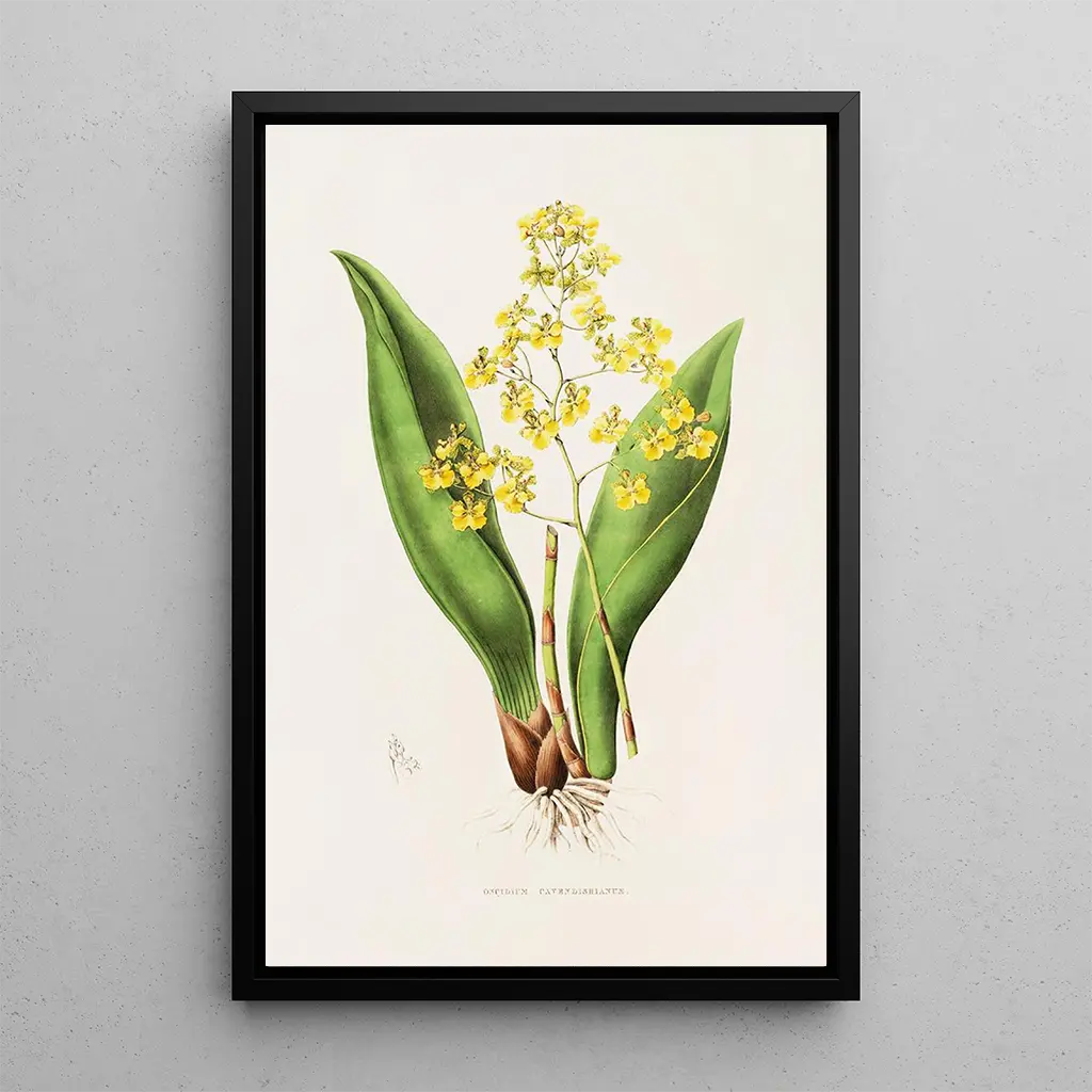 Oncidium Cavendishianum, ze swoimi delikatnymi kwiatami i żywymi odcieniami, przywołuje pełen życia taniec kwiatowy. Płatki, ozdobione skomplikowanymi wzorami, otwierają się jak gwiazdy na tropikalnym niebie, podczas gdy odcienie żółci i brązu tworzą uderzający kontrast. To dzieło, wykonane z precyzyjną techniką, oddaje istotę natury, oferując atmosferę jednocześnie radosną i uspokajającą. Harmonijna kompozycja tego druku artystycznego pozwala docenić każdy szczegół, oddając hołd efemerycznej urodzie storczyków.