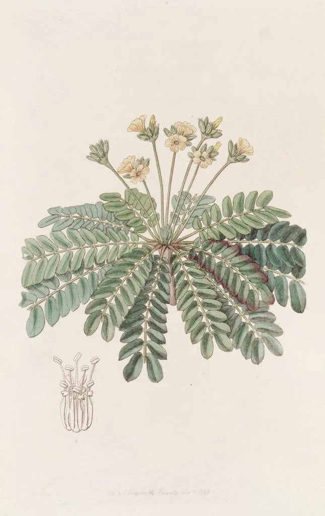 L'Oxalis sensible, z liśćmi w kształcie serca i delikatnymi kwiatami, jest dziełem, które wywołuje skojarzenia z kruchością i pięknem natury. Sydenham Edwards, poprzez tę ilustrację, potrafi uchwycić istotę tej rośliny, grając na odcieniach zieleni i fioletu, tworząc uspokajającą kompozycję. Technika akwareli pozwala oddać subtelności światła i cienia, oferując spokojną i kontemplacyjną atmosferę. Każdy szczegół jest podkreślony, zachęcając widza do docenienia prostoty i elegancji tego kwiatu.