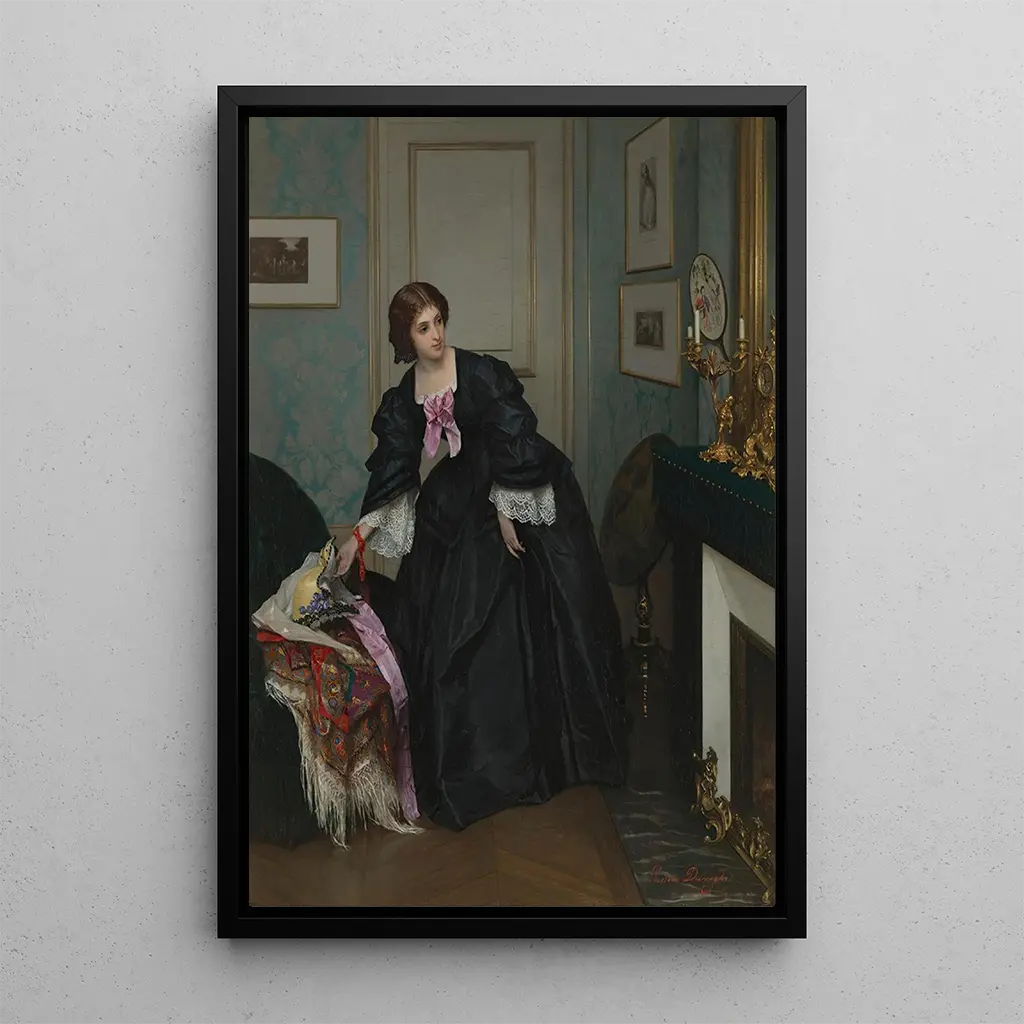 W tej reprodukcji "Spójrz na zegar" Gustave Léonard de Jonghe ukazuje atmosferę pełną łagodności i melancholii. Kompozycja przedstawia kontemplującą kobietę, zatopioną w myślach, podczas gdy przyciemnione światło delikatnie oświetla scenę. Pastelowe odcienie i wyrafinowane detale tworzą intymną, niemal marzycielską atmosferę. Technika de Jonghe, łącząca realizm z wrażliwością, pozwala odczuć emocje emanujące z tego obrazu, zachęcając widza do chwili refleksji.