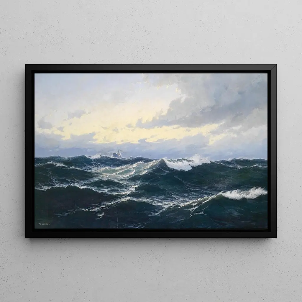 Morzeiczny pejzaż z parowcem: harmonia między niebem a morzem W tym urzekającym dziele, obraz "Morzeiczny pejzaż z parowcem" autorstwa Maxa Jensena przenosi nas nad brzegiem wody, gdzie para unosi się delikatnie, tworząc atmosferę spokoju. Odcienie niebieskiego i zielonego harmonijnie się łączą, przywołując głębię oceanów i lekkość niebios. Technika Jensena, zarazem impresjonistyczna i realistyczna, pozwala odczuć ruch fal i delikatność bryzy. Każde pociągnięcie pędzla zdaje się opowiadać historię, zachęcając widza do zanurzenia się w ten uspokajający pejzaż morski. Max Jensen: mistrz pejzażu morskiego Max Jensen, artysta XIX wieku, jest ceniony za umiejętność uchwycenia piękna pejzaży morskich. Pod wpływem wielkich mistrzów impresjonizmu, wypracował unikalny styl łączący realizm i poezję. Jego dzieła, często inspirowane podróżami wzdłuż wybrzeży, świadczą o głębokim podziwie dla natury. W tamtym okresie artyści dążyli do przedstawiania światła i atmosfery, a Jensen z powodzeniem uwiecznił te elementy na swoich obrazach. Jego dziedzictwo trwa, a "Morzeiczny pejzaż z parowcem" pozostaje jednym z jego najbardziej ikonicznych dzieł. Dekoracyjny druk artystyczny o wielu zaletach Reprodukcja "Morzeicznego pejzażu z parowcem" to idealny element dekoracyjny do różnych przestrzeni życiowych. Niezależnie od tego, czy w salonie, biurze czy sypialni, ten obraz wnosi odrobinę elegancji i spokoju. Jakość reprodukcji gwarantuje wierne oddanie szczegółów i kolorów oryginału, umożliwiając pełne cieszenie się dziełem. Estetyczna atrakcyjność tego płótna tkwi w jego zdolności do wywoływania emocji i tworzenia relaksującej atmosfery. Wybierając ten druk artystyczny, dodajesz wnętrzu zaproszenie do kontemplacji i ucieczki.