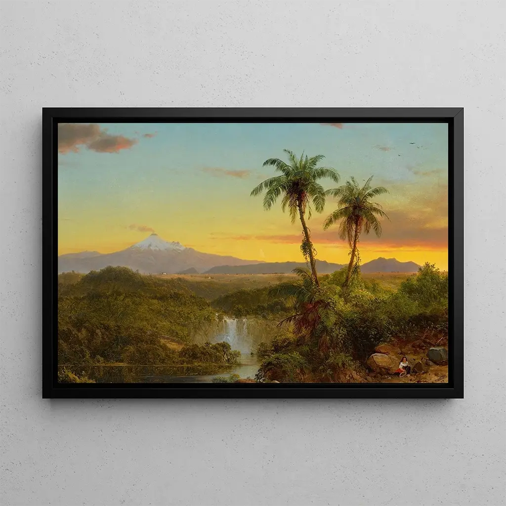 Obraz "Krajobraz południowoamerykański" autorstwa Frederica Edwina Churcha przenosi widza w serce naturalnego i dzikiego piękna kontynentu południowoamerykańskiego. Dzięki żywym kolorom i drobiazgowym szczegółom, dzieło ukazuje majestatyczne pejzaże, gdzie góry dumnie wznoszą się ku niebu, a bujna roślinność rozciąga się aż po horyzont. Atmosfera tej płótna jest jednocześnie spokojna i wielka, zachęcając do głębokiej kontemplacji natury i jej cudów.