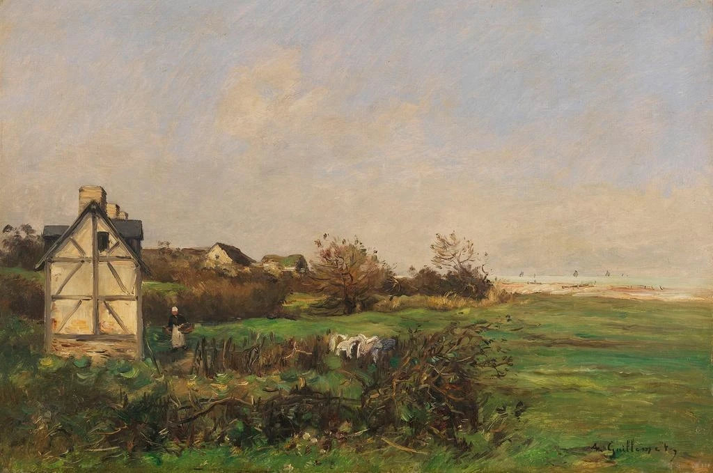 Krajobraz z domem szachulcowym i wiejską kobietą - Antoine Guillemet
