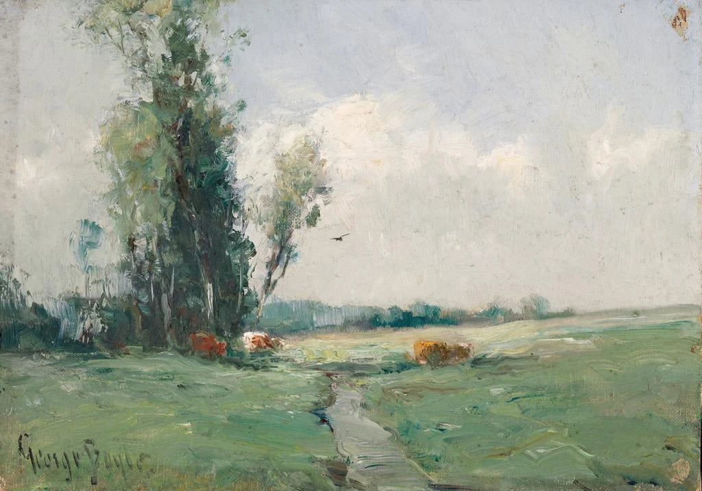 Druk artystyczny krajobraz z potokiem autorstwa George'a A. Boyle'a ukazuje spokojną naturę, gdzie migocząca woda potoku miesza się z otaczającą zielenią. Delikatne i naturalne kolory, od jaskrawych zieleni po uspokajające odcienie niebieskiego, tworzą atmosferę spokoju i harmonii. Technika malarstwa olejnego pozwala oddać refleksy na wodzie oraz teksturę liści z dużą precyzją. Ten obraz zachęca do kontemplacji, przenosząc widza w idylliczny świat, daleko od miejskiego zgiełku, gdzie piękno natury ukazuje się w pełnej krasie.