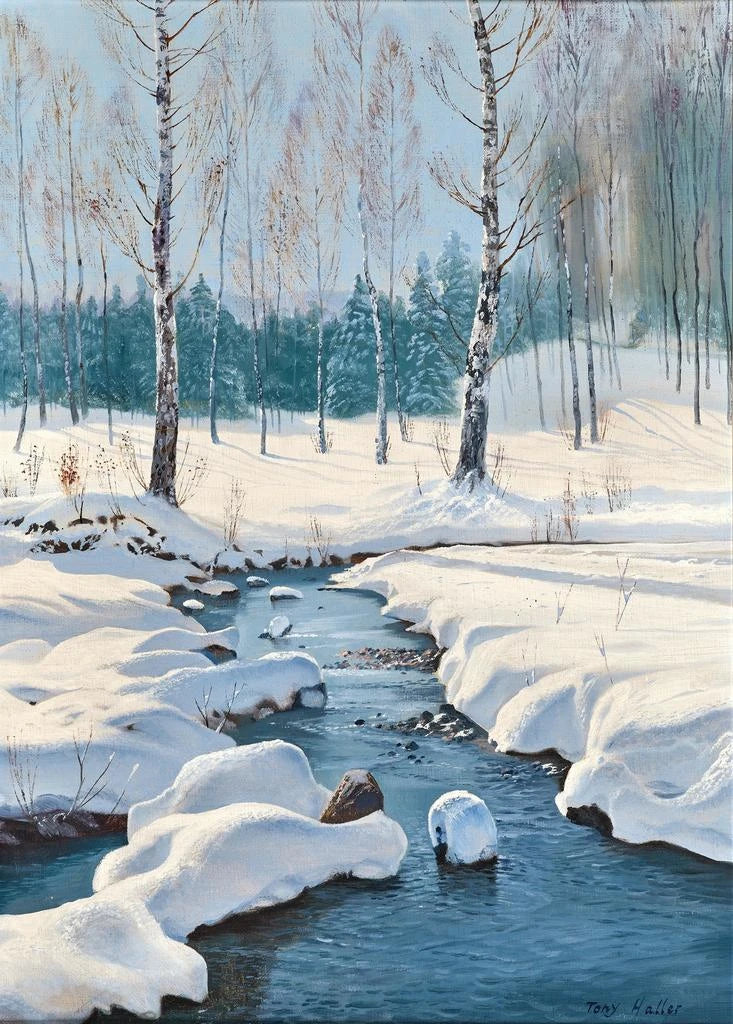 Druk artystyczny krajobraz zimowy z potokiem przenosi nas w spokojny świat, gdzie śnieg delikatnie pokrywa ziemię i drzewa. Scena ożywa dzięki wijącemu się potokowi, który dodaje ruchu tej zimowej ciszy. Odcienie bieli, błękitu i szarości harmonijnie się łączą, tworząc łagodną i kojącą atmosferę. Technika malarska Toni Haller, z jej delikatnymi pociągnięciami pędzla, oddaje świeżość powietrza i efemeryczną urodę zimy, zachęcając widza do odczuwania magii tego sezonu.