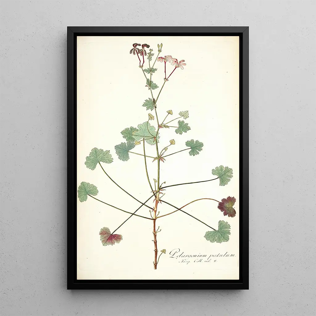 Druk artystyczny obrazu Pelargonium patulum, dzieła Nikolausa Josefa Freiherr von Jacquina, wyróżnia się szczegółowym i poetyckim przedstawieniem tej rośliny. Żywe kolory, od jaskrawych zieleni po delikatne róże, tworzą żywą i przyjazną atmosferę. Technika akwareli, połączona z precyzyjnym pociągnięciem pędzla, pozwala uchwycić lekkość płatków i fakturę liści. Każdy szczegół jest starannie opracowany, zachęcając widza do zanurzenia się w botaniczny świat Jacquina, gdzie natura ukazuje się w pełnej krasie.