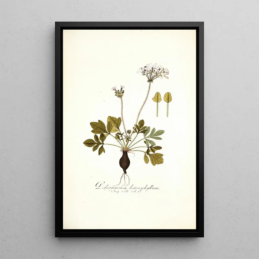 Druk artystyczny Pelargonium heterophyllum, wykonany przez Nikolausa Josepha Freiherr von Jacquina, jest celebracją bogactwa flory. To dzieło, pełne delikatności, przedstawia liście o różnych kształtach i żywe kolory, które przyciągają wzrok. Technika akwareli, używana z finezją, pozwala oddać przezroczystość płatków i fakturę liści, tworząc atmosferę jednocześnie żywą i uspokajającą. Każdy szczegół jest starannie obserwowany, świadcząc o pasji do botaniki i pragnieniu dzielenia się pięknem natury.