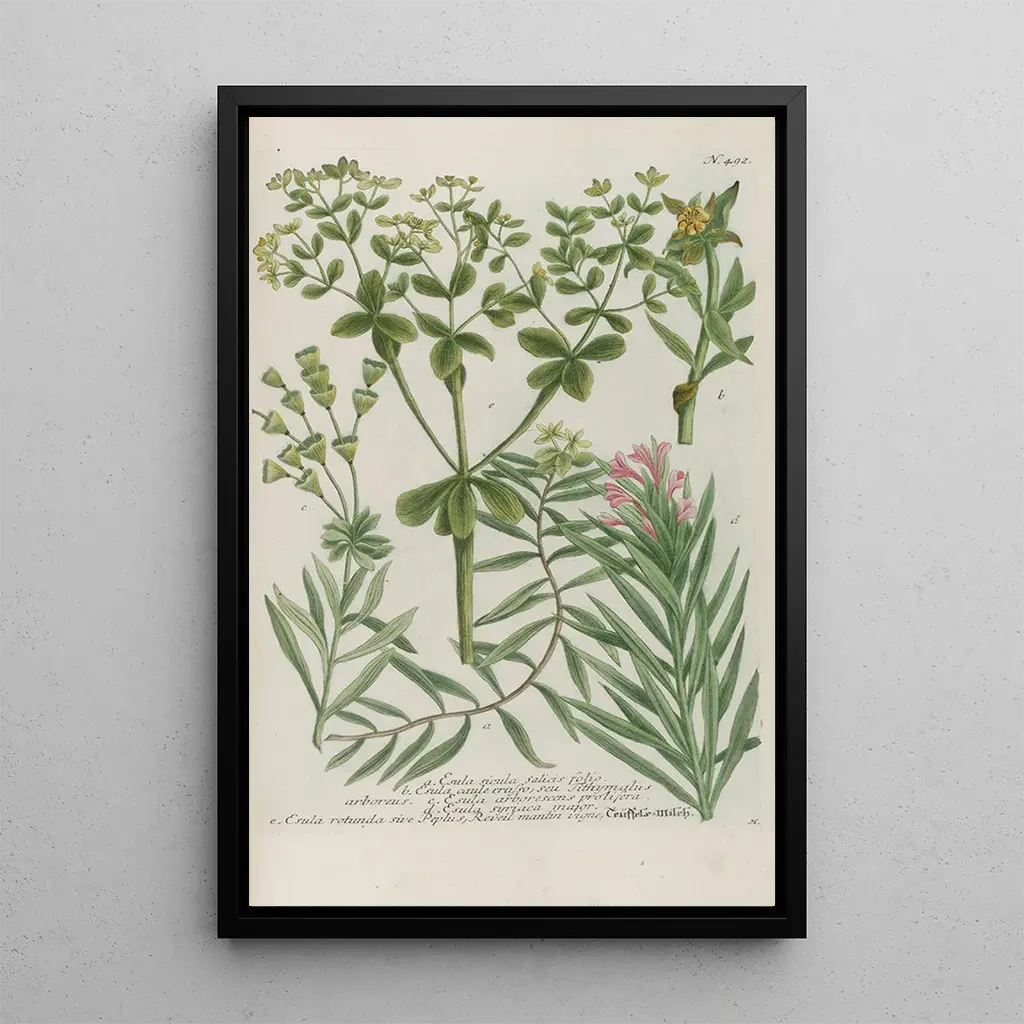Druk artystyczny dzieła Phytanthoza iconographia Pl215 przenosi nas do świata, w którym flora jest ukazana z niezwykłą precyzją. Ilustracje, o uderzającej klarowności, przedstawiają różnorodne rośliny o różnych kształtach i kolorach, tworząc żywą i dynamiczną atmosferę. Technika druku, wzbogacona akwarelowymi akcentami, nadaje każdej roślinie niemal dotykową wymiarowość, zachęcając do eksploracji. Dzieło nie tylko ukazuje piękno natury, ale także podkreśla znaczenie botanicznej dokumentacji w czasach, gdy nauka i sztuka się przenikały.
